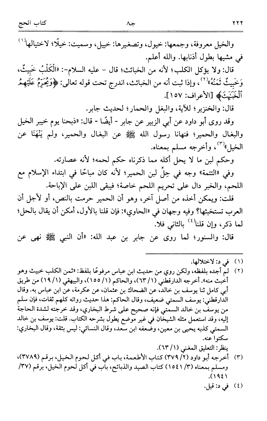 وقد روى أبو داود عن أبي الزبير عن جابر- أيضاً- قال: "ذبحنا يوم خيبر الخيل والبغال والحمير؛ فنهانا رسول الله - صلى الله عليه وسلم - عن البغال والحمير، ولم يَنْهَنَا عن الخيل"، وأخرجه مسلم بمعناه.
