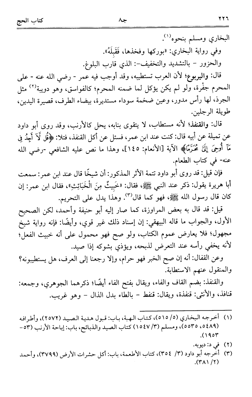 قال: والقنفذ؛ لأنه مستطاب، لا يتقوى بنابه، يحل كالأرنب، وقد روى أبو داود عن تميلة عن أبيه قال: كنت عند ابن عمر، فسئل عن أكل القنفذ، فتلا: {قُلْ لا أَجِدُ فِي مَا أُوحِيَ إِلَيَّ مُحَرَّماً} الآية [الأنعام: 145]، وهذا ما نص عليه الشافعي- رضي الله عنه- في كتاب الطعام.