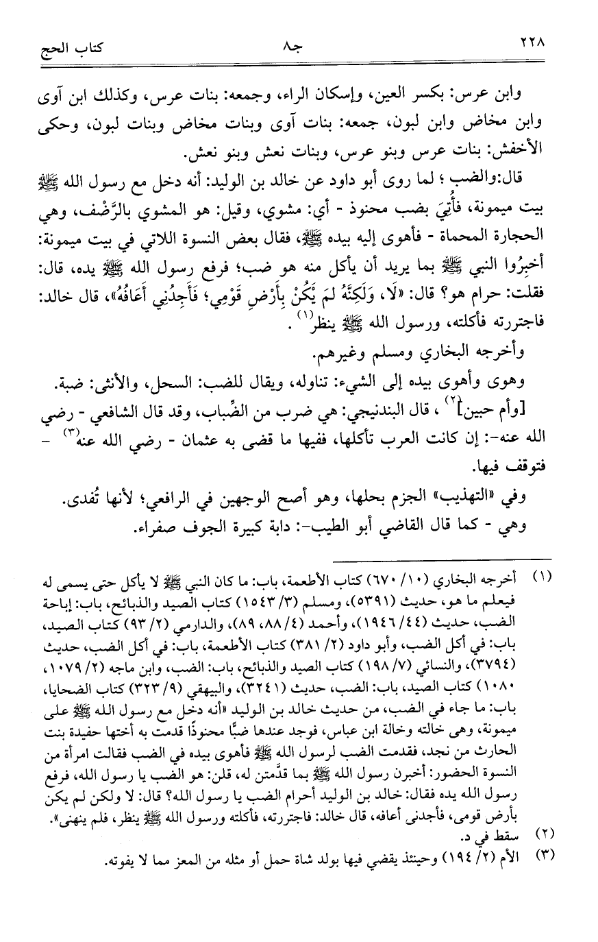قال: والضب؛ لما روى أبو داود عن خالد بن الوليد: أنه دخل مع رسول الله - صلى الله عليه وسلم - بيت ميمونة، فأُتِيَ بضب محنوذ- أي: مشوي، وقيل: هو المشوي بالرَّضْف، وهي الحجارة المحماة- فأهوى إليه بيده - صلى الله عليه وسلم - فقال بعض النسوة اللاتي في بيت ميمونة: أخبروا النبي - صلى الله عليه وسلم - بما يريد أن يأكل منه هو ضب؛ فرفع رسول الله - صلى الله عليه وسلم - يده، قال: فقلت: حرام هو؟ قال: "لاَ، وَلَكِنَّهُ لمَ يَكُنْ بِأَرْضِ قَوْمِي؛ فَأَجِدُنِي أَعَافُهُ"، قال خالد: فاجتررته فأكلته، ورسول الله - صلى الله عليه وسلم - ينظر.