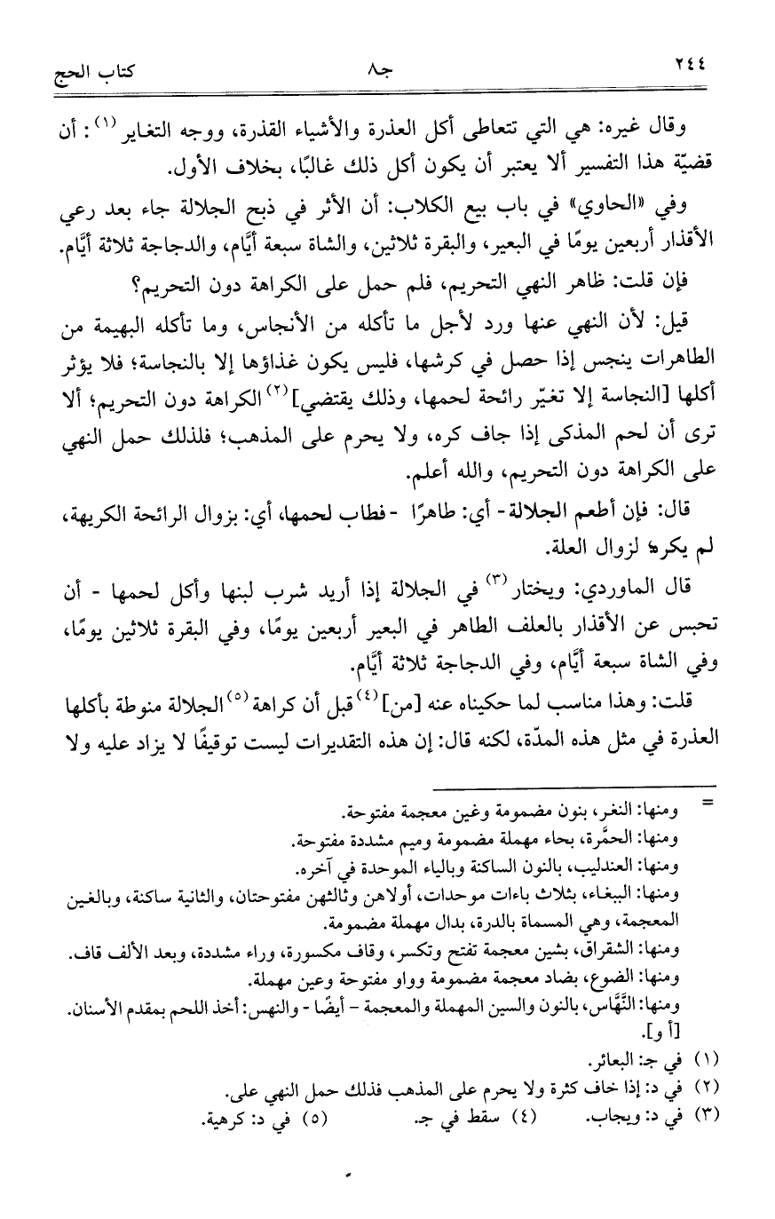 قال الماوردي: ويختار في الجلالة إذا أريد شرب لبنها وأكل لحمها- أن تحبس عن الأقذار بالعلف الطاهر في البعير أربعين يوماً، وفي البقرة ثلاثين يوماً، وفي الشاة سبعة أيام، وفي الدجاجة ثلاثة أيام.