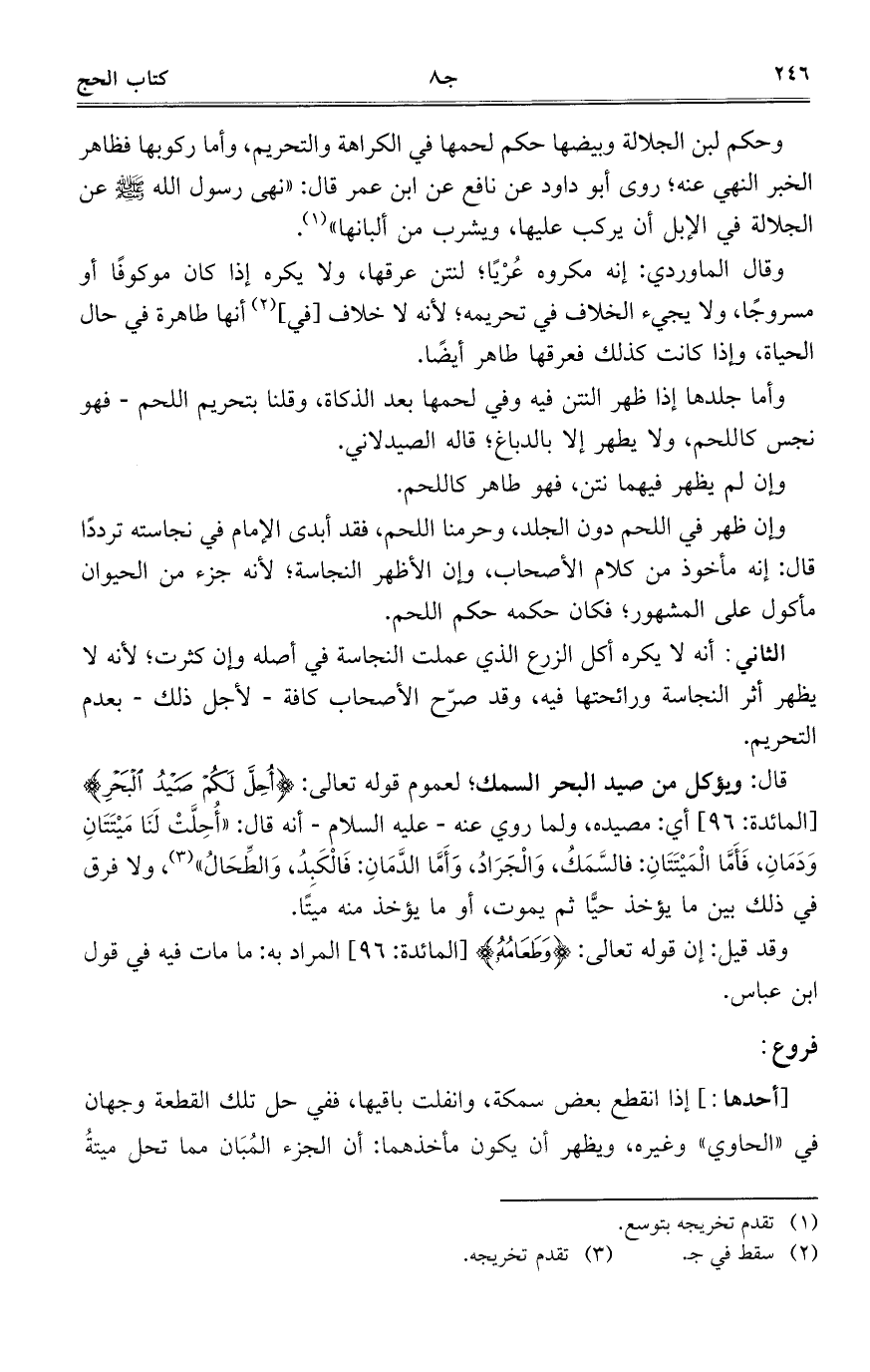 وحكم لبن الجلالة وبيضها حكم لحمها في الكراهة والتحريم، وأما ركوبها فظاهر الخبر النهي عنه؛ روى أبو داود عن نافع عن ابن عمر قال: "نهى رسول الله - صلى الله عليه وسلم - عن الجلالة في الإبل أن يركب عليها، ويشرب من ألبانها.
