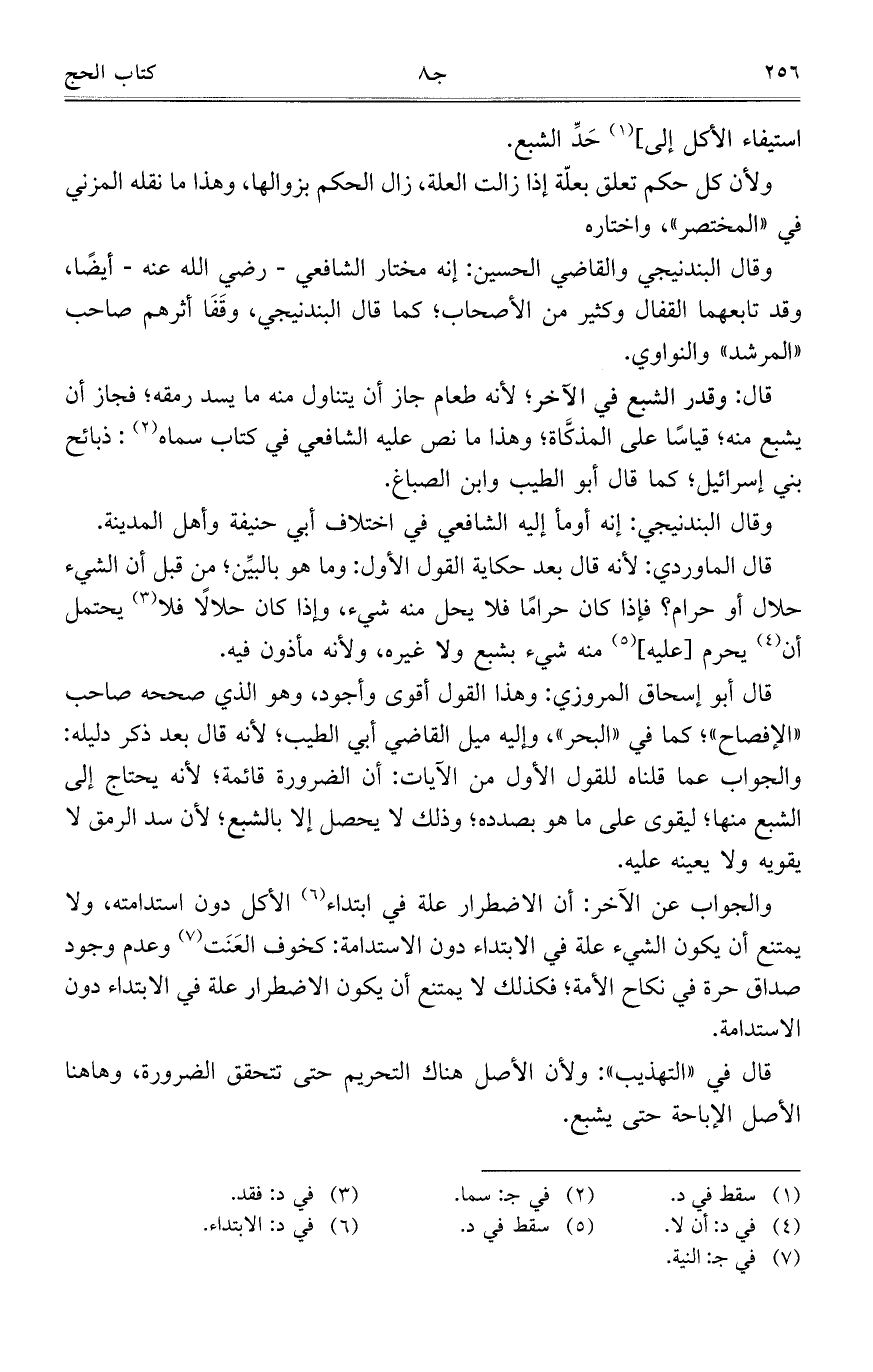 قال: وقدر الشبع في الآخر؛ لأنه طعام جاز أن يتناول منه ما يسد رمقه؛ فجاز أن يشبع منه؛ قياساً على المذكاة؛ وهذا ما نص عليه الشافعي في كتاب سماه: ذبائح بني إسرائيل؛ كما قال أبو الطيب وابن الصباغ.