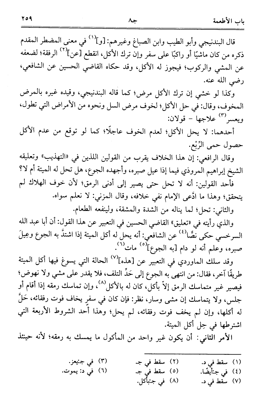 وقد سلك الماوردي في التعبير عن [هذه] الحالة التي يسوغ فيها أكل الميتة طريقاً آخر، فقال: من انتهى به الجوع إلى حَدِّ التلف، فلا يقدر على مشي ولا نهوض؛ فيصير غير متماسك الرمق إلا بأكل، كان له بالأكل، وإن تماسك رمقه إذا أقام أو جلس، ولا يتماسك إن مشى وسار، نظر: فإن كان في سفر يخاف فوت رفقائه، حلَّ له أكلها، وإن لم يخف فوت رفقائه، لم يحل؛ وهذا أحد الشروط الأربعة التي اشترطها في حل أكل الميتة.