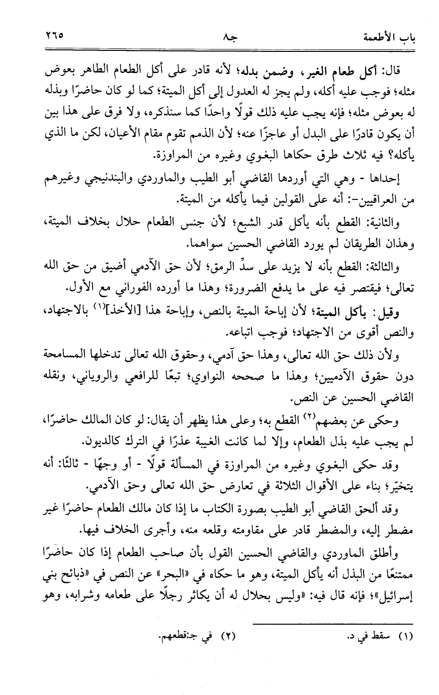 وأطلق الماوردي والقاضي الحسين القول بأن صاحب الطعام إذا كان حاضراً ممتنعاً من البذل أنه يأكل الميتة، وهو ما حكاه في "البحر" عن النص في "ذبائح بني إسرائيل"؛ فإنه قال فيه: "وليس بحلال له أن يكاثر رجلاً على طعامه وشرابه، وهو