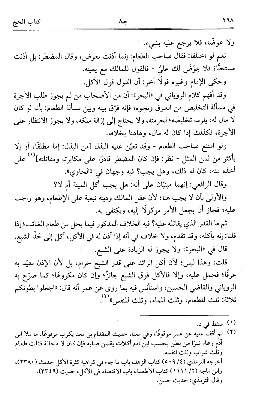 قلت: وهذا ليس؛ لأن أكل الزائد على قدر الشبع حرام، بل لأن الإذن مقيد به عرفاً؛ فحمل عليه، وإلا فالأكل فوق الشبع جائز؛ وإن كان مكروهاً؛ كما صرح به الروياني والقاضي الحسين، واستأنس فيه بما روى عن عمر أنه قال: "اجعلوا بطونكم ثلاثة: ثلث للطعام، وثلث للماء، وثلث للنفس".