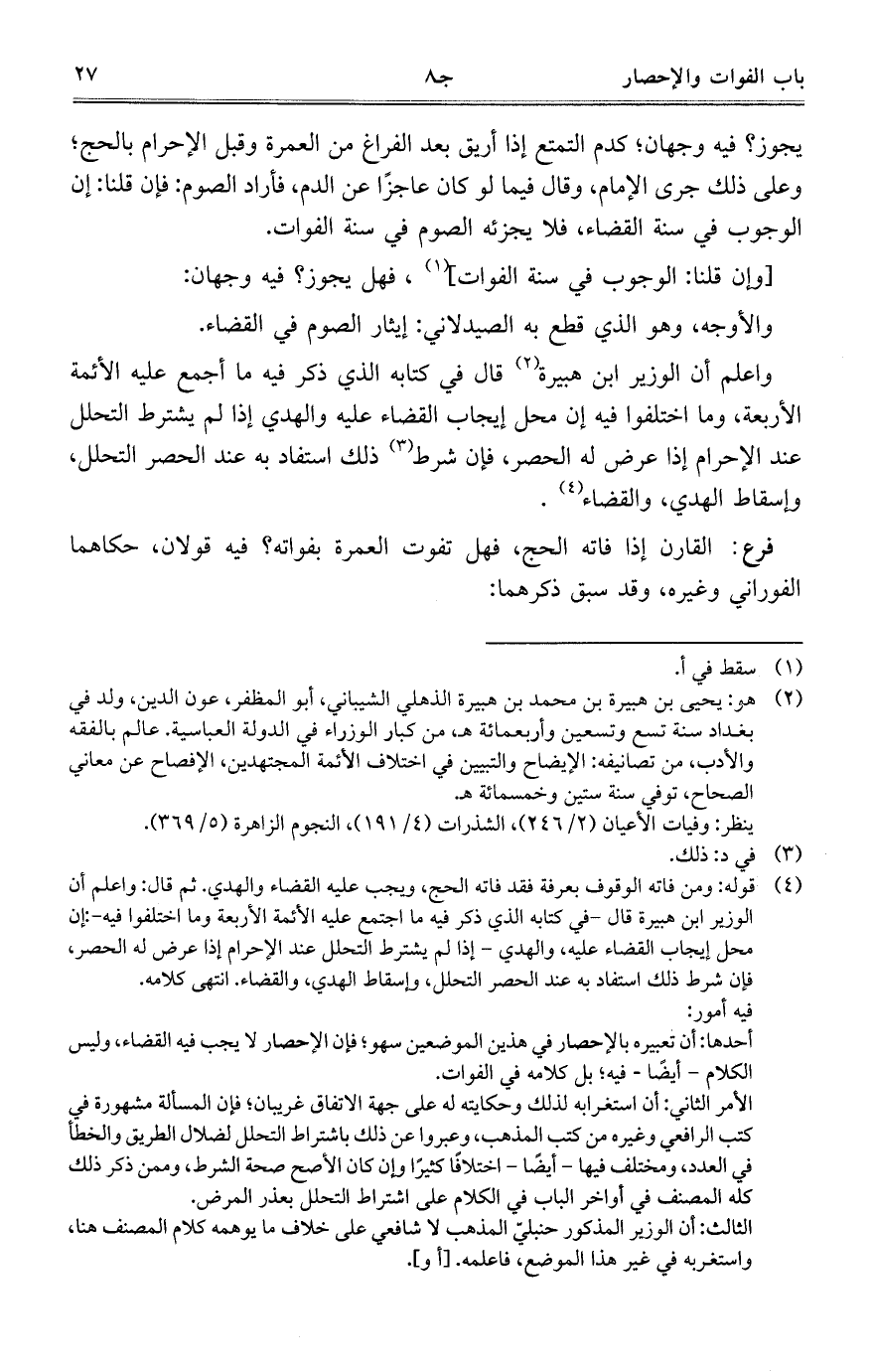 واعلم أن الوزير ابن هبيرة قال في كتابه الذي ذكر فيه ما أجمع عليه الأئمة الأربعة، وما اختلفوا فيه إن محل إيجاب القضاء عليه والهدي إذا لم يشترط التحلل عند الإحرام إذا عرض له الحصر، فإن شرط ذلك استفاد به عند الحصر التحلل، وإسقاط الهدي، والقضاء.