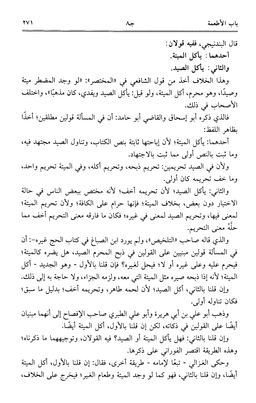 وإن قلنا بالثاني: فهل يأكل الميتة أو الصيد؟ فيه القولان، وتوجيههما ما ذكرناه؛ وهذه الطريقة اقتصر الفوراني على ذكرهما.