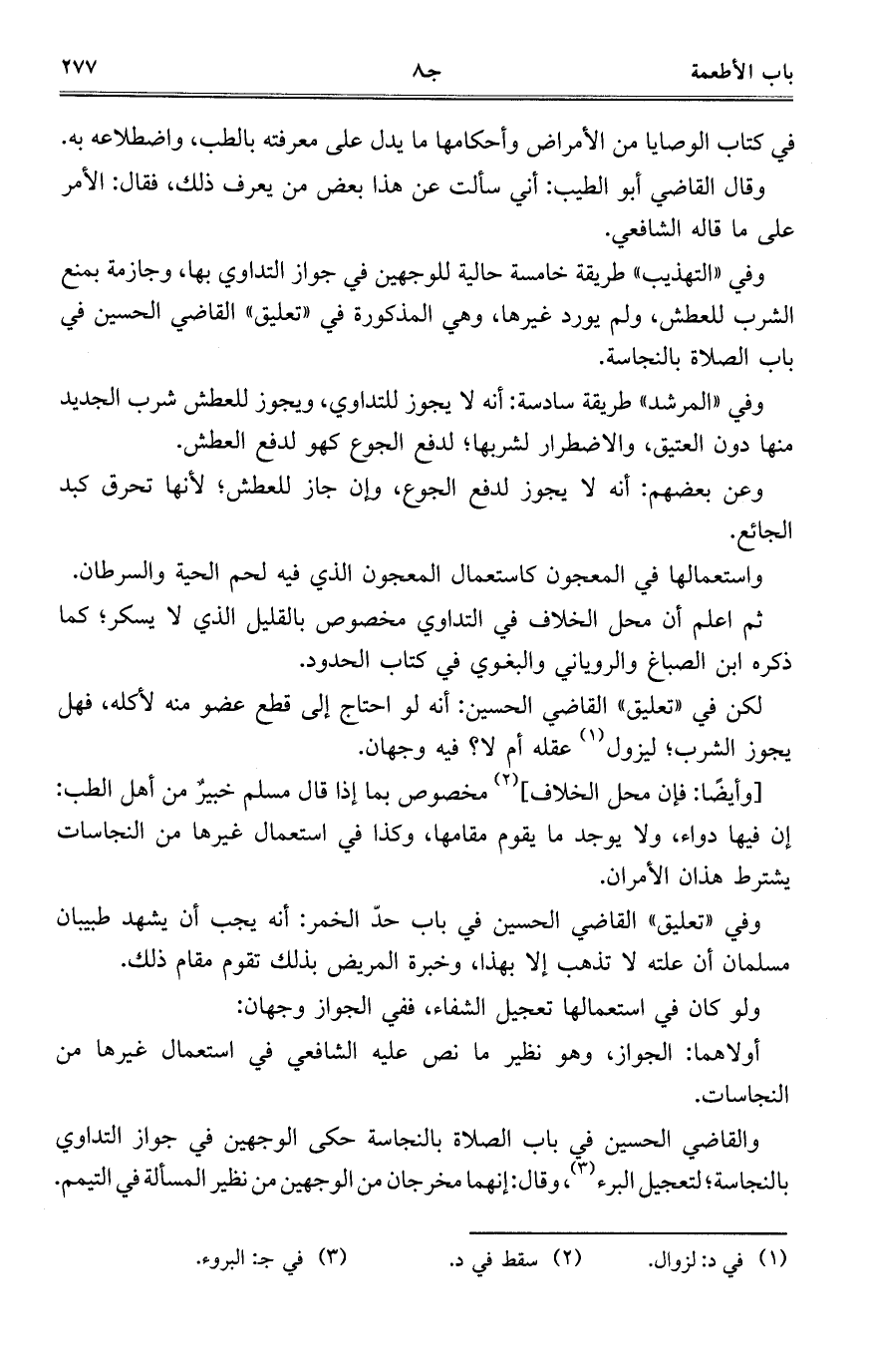 وفي "التهذيب" طريقة خامسة حالية للوجهين في جواز التداوي بها، وجازمة بمنع الشرب للعطش، ولم يورد غيرها، وهي المذكورة في "تعليق" القاضي الحسين في باب الصلاة بالنجاسة.