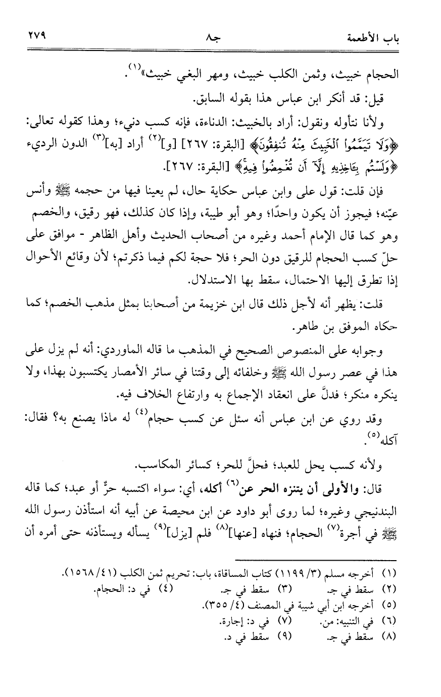 فإن قلت: قول على وابن عباس حكاية حال، لم يعينا فيها من حجمه - صلى الله عليه وسلم - وأنس عينه؛ فيجوز أن يكون واحداً؛ وهو أبو طيبة، وإذا كان كذلك، فهو رقيق، والخصم وهو كما قال الإمام أحمد وغيره من أصحاب الحديث وأهل الظاهر- موافق على حل كسب الحجام للرقيق دون الحر؛ فلا حجة لكم فيما ذكرتم؛ لأن وقائع الأحوال إذا تطرق إليها الاحتمال، سقط بها الاستدلال.