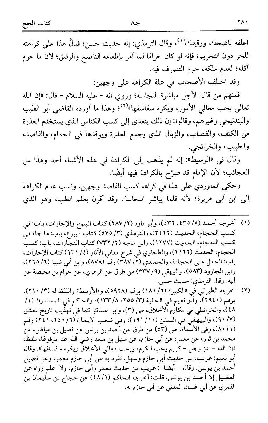 أعلفه ناضحك ورقيقك، وقال الترمذي، إنه حديث حسن؛ فدل هذا على كراهته للحر دون التحريم، فإنه لو كان حراماً لما أمر بإطعامه الناضح والرقيق؛ لأن ما حرم أكله؛ لعدم ملكه، حرم التصرف فيه.