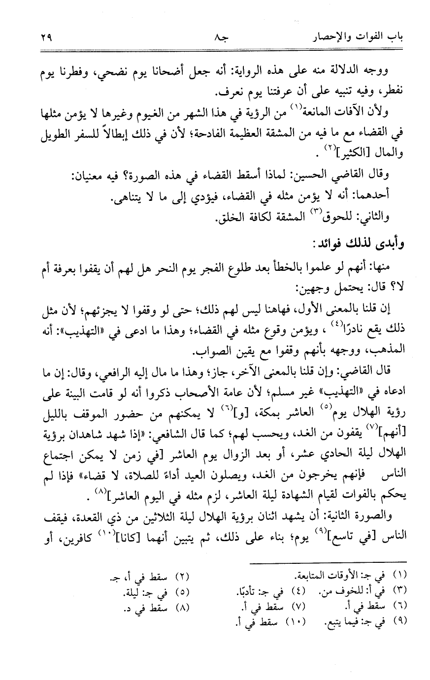 قال القاضي: وإن قلنا بالمعنى الآخر؛ جاز؛ وهذا ما مال إليه الرافعي؛ وقال: إن ما ادعاه في "التهذيب" غير مسلم؛ لأن عامة الأصحاب ذكروا أنه لو قامت البينة على رؤية الهلال يوم العاشر بمكة، [و] لا يمكنهم من حضور الموقف بالليل [أنهم] يقفون من الغد، ويحسب لهم؛ كما قال الشافعي: "إذا شهد شاهدان برؤية الهلال ليلة الحادي عشر، أو بعد الزوال يوم العاشر [في زمن لا يمكن اجتماع الناس فإنهم يخرجون من الغد، ويصلون العيد أداءً للصلاة، لا قضاء" فإذا لم يحكم بالفوات لقيام الشهادة ليلة العاشر، لزم مثله في اليوم العاشر].