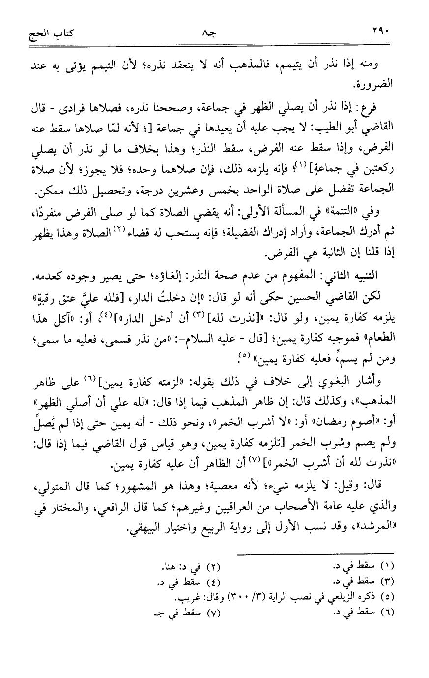 وأشار البغوي إلى خلاف في ذلك بقوله: "لزمته كفارة يمين] على ظاهر المذهب"، وكذلك قال: إن ظاهر المذهب فيما إذا قال: "لله علي أن أصلي الظهر" أو: "أصوم رمضان" أو: "لا أشرب الخمر"، ونحو ذلك- أنه يمين حتى إذا لم يصل ولم يصم وشرب الخمر [تلزمه كفارة يمين، وهو قياس قول القاضي فيما إذا قال: "نذرت لله أن أشرب الخمر"] أن الظاهر أن عليه كفارة يمين.