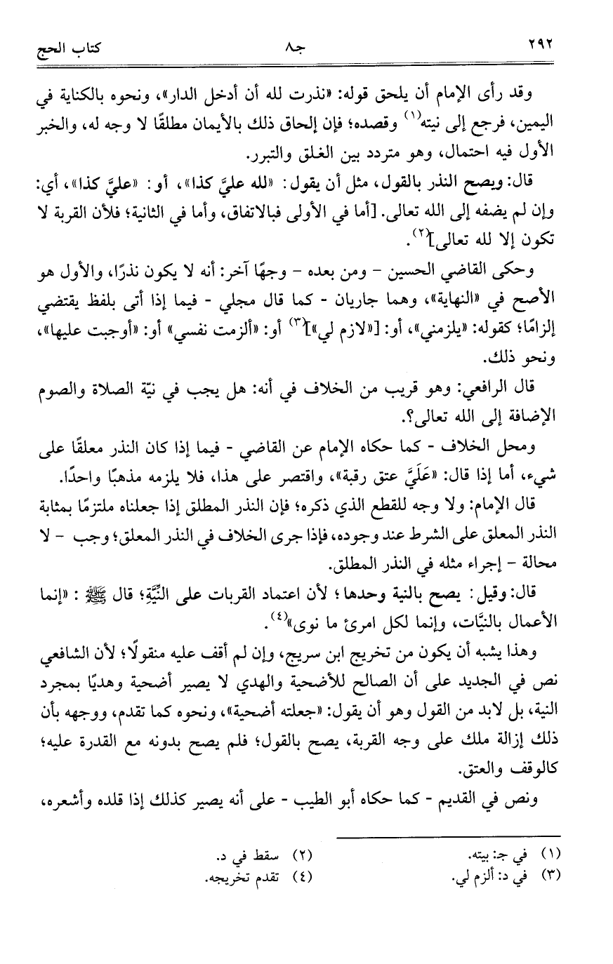 وقد رأى الإمام أن يلحق قوله: "نذرت لله أن أدخل الدار"، ونحوه بالكناية في اليمين، فرجع إلى نيته وقصده؛ فإن إلحاق ذلك بالأيمان مطلقاً لا وجه له، والخبر الأول فيه احتمال، وهو متردد بين الغلق والتبرر.