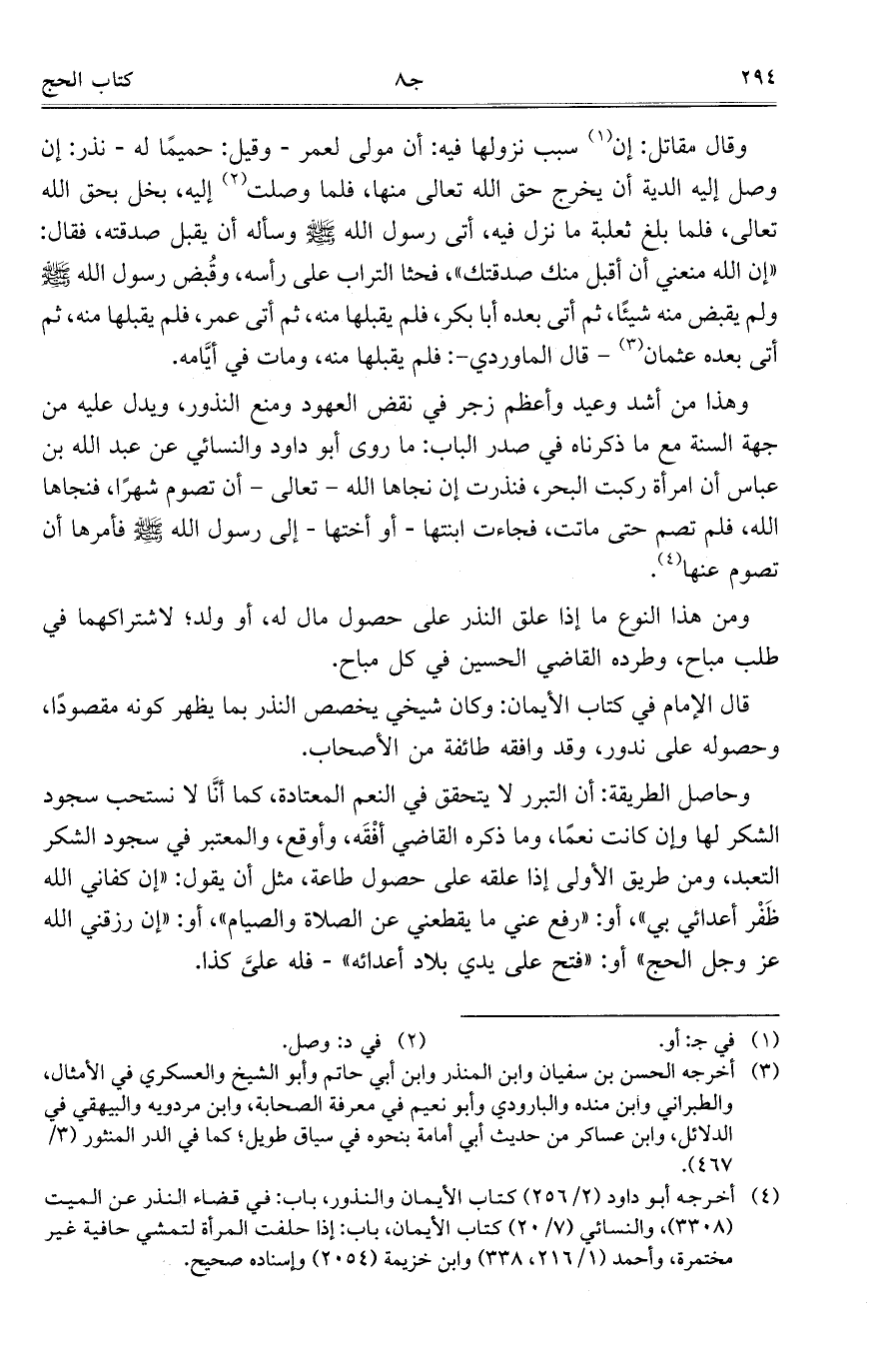 وهذا من أشد وعيد وأعظم زجر في نقض العهود ومنع النذور، ويدل عليه من جهة السنة مع ما ذكرناه في صدر الباب: ما روى أبو داود والنسائي عن عبد الله بن عباس أن امرأة ركبت البحر، فنذرت إن نجاها الله- تعالى- أن تصوتم شهراً، فنجاها الله، فلم تصم حتى ماتت، فجاءت ابنتها- أو أختها- إلى رسول الله - صلى الله عليه وسلم - فأمرها أن تصوم عنها.