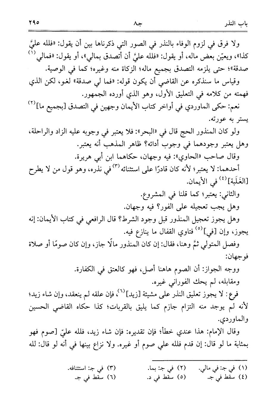 ولا فرق في لزوم الوفاء بالنذر في الصور التي ذكرناها بين أن يقول: "فلله علي كذا"، ويعين بعض ماله، أو يقول: "فلله علي أن أتصدق بمالي"، أو يقول: "فمالي صدقة"؛ حتى يلزمه التصدق بجميع ماله؛ الزكاة منه وغيره؛ كما في الوصية.