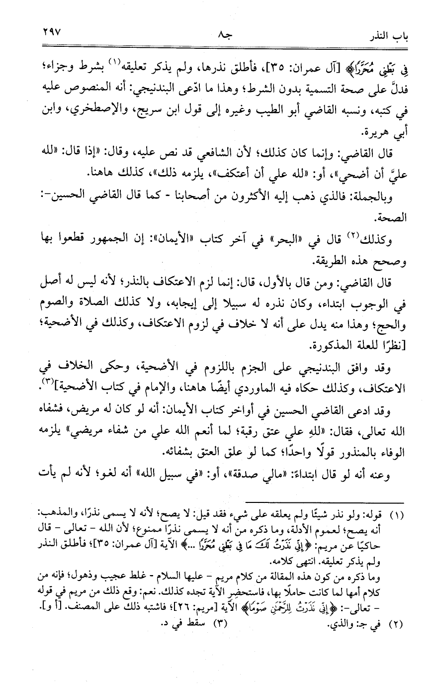 فِي بَطْنِي مُحَرَّراً} [آل عمران: 35] فأطلق نذرها، ولم يذكر تعليقه بشرط وجزاء؛ فدل على صحة التسمية بدون الشرط؛ وهذا ما ادعى البندنيجي: أنه المنصوص عليه في كتبه، ونسبه القاضي أبو الطيب وغيره إلى قول ابن سريج، والإصطخري، وابن أبي هريرة.