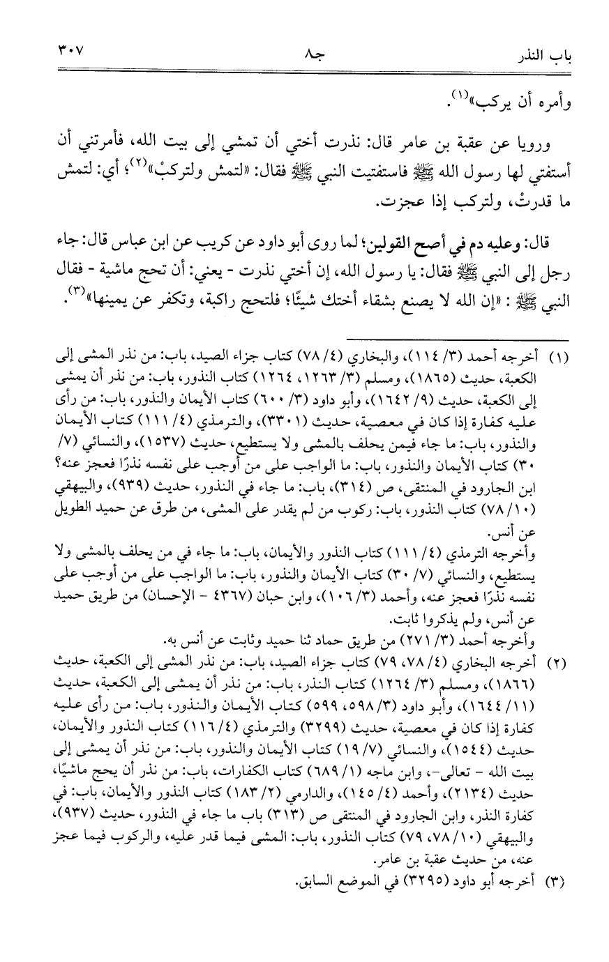 ورويا عن عقبة بن عامر قال: نذرت أختي أن تمشي إلى بيت الله، فأمرتني أن أستفتي لها رسول الله - صلى الله عليه وسلم - فاستفتيت النبي - صلى الله عليه وسلم - فقال: "لتمش ولتركب"؛ أي: لتمش ما قدرت، ولتركب إذا عجزت.