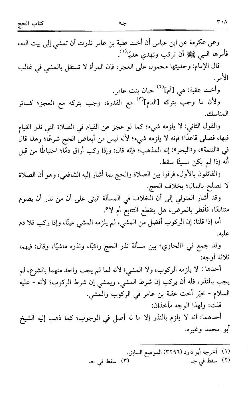 قال الإمام: وحديثها محمول على العجز، فإن المرأة لا تستقل بالمشي في غالب الأمر.