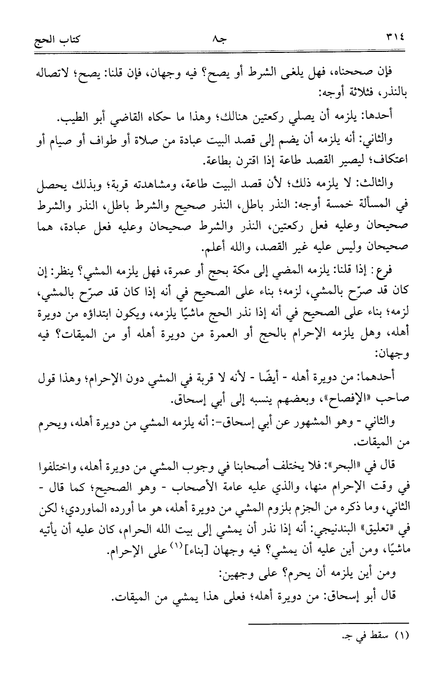 والثالث: لا يلزمه ذلك؛ لأن قصد البيت طاعة، ومشاهدته قربة؛ وبذلك يحصل في المسألة خمسة أوجه: النذر باطل، النذر صحيح والشرط باطل، النذر والشرط باطل، النذر والشرط صحيحان وعليه فعل ركعتين، النذر والشرط صحيحان وعليه فعل عبادة، هما صحيحان وليس عليه غير القصد، والله أعلم.