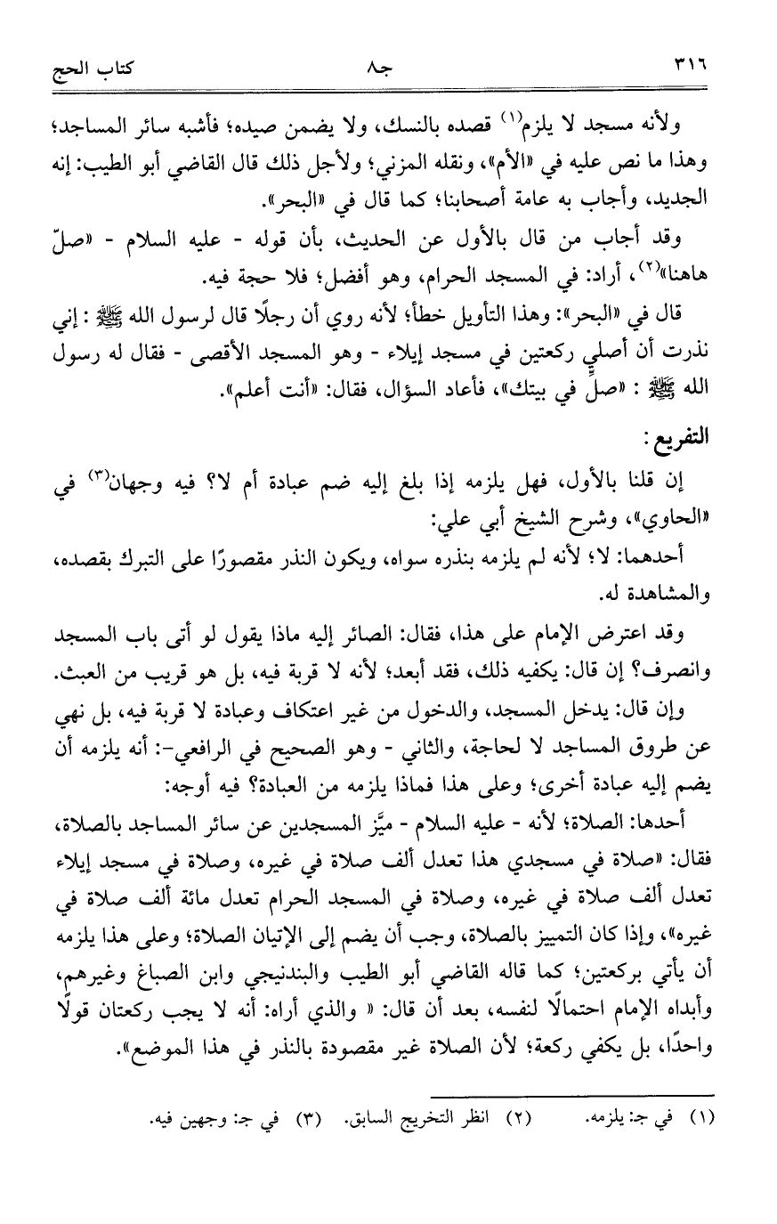 قال في "البحر": وهذا التأويل خطأ؛ لأنه روي أن رجلاً قال لرسول الله - صلى الله عليه وسلم -: إني نذرت أن أصلي ركعتين في مسجد إيلاء- وهو المسجد الأقصى- فقال له رسول الله - صلى الله عليه وسلم -: "صل في بيتك"، فأعاد السؤال، فقال: "أنت أعلم".