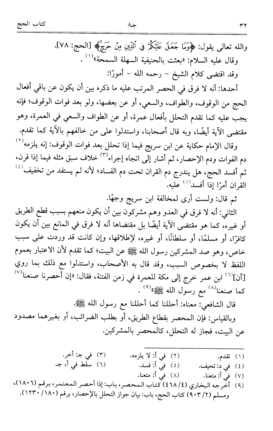 الثاني: أنه لا فرق في العدو وهم مشركون بين أن يكون منعهم بسبب قطع الطريق أو غيره، كما هو مقتضى الآية أيضاً بل مقتضاها أنه لا فرق في المانع بين أن يكون كافراً، أو مسلماً، أو سلطاناً، أو غيره، لإطلاقها، وإن كانت قد وردت على سبب خاص، وهو صد المشركين رسول الله - صلى الله عليه وسلم - عن البيت؛ كما تقدم لأن الاعتبار بعموم اللفظ لا بخصوص السبب، وقد قال به الأصحاب، واستدلوا مع ذلك بما روي [أن] ابن عمر خرج إلى مكة للعمرة في زمن الفتنة، فقال: "إن أحصرنا صنعنا كما صنعنا مع رسول الله - صلى الله عليه وسلم - ".