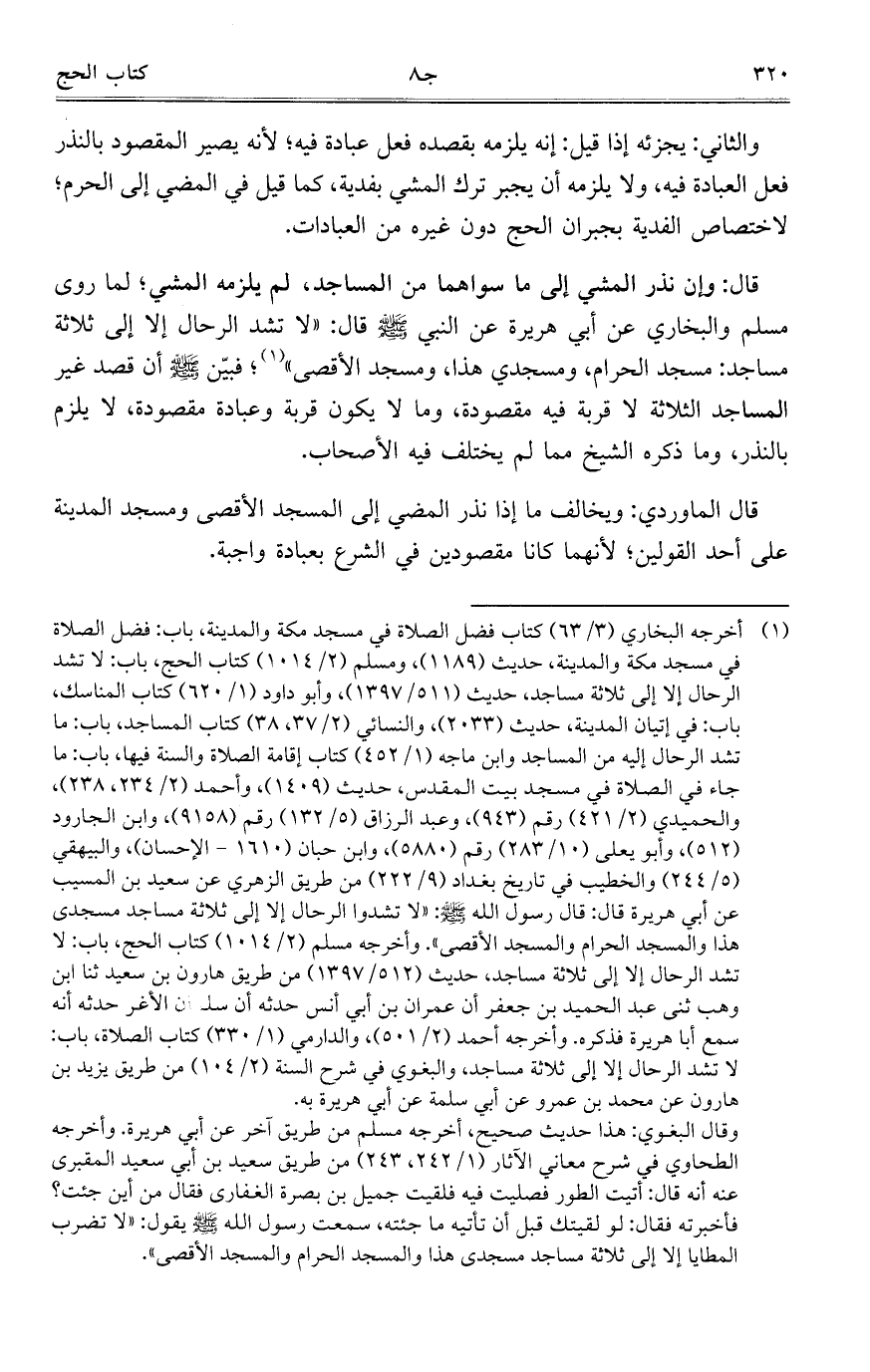 قال: وإن نذر المشي إلى ما سواهما من المساجد، لم يلزمه المشي؛ لما روى مسلم والبخاري عن أبي هريرة عن النبي - صلى الله عليه وسلم - قال: "لا تشد الرحال إلا إلى ثلاثة مساجد: مسجد الحرام، ومسجدي هذا، ومسجد الأقصى"؛ فبين - صلى الله عليه وسلم - أن قصد غير المساجد الثلاثة لا قربة فيه مقصودة، وما لا يكون قربة وعبادة مقصودة، لا يلزم بالنذر، وما ذكره الشيخ مما لم يختلف فيه الأصحاب.