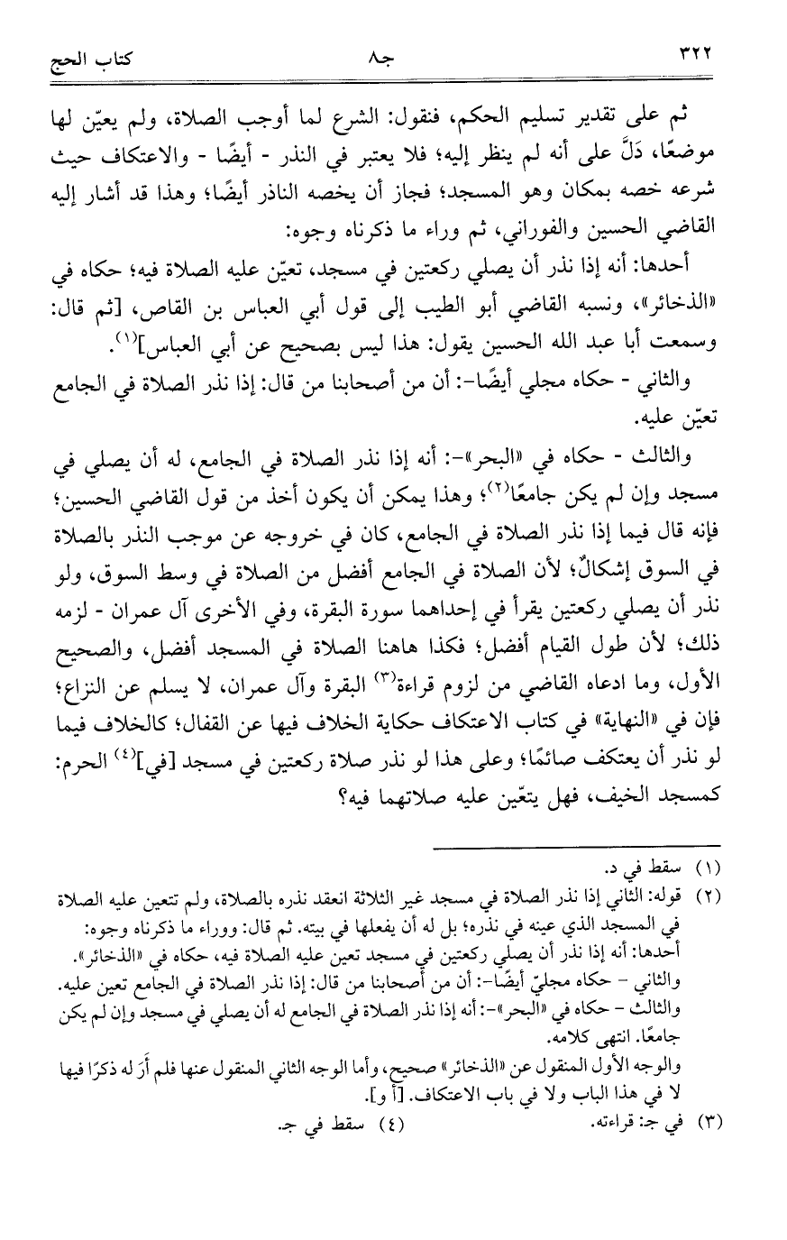 والثالث- حكاه في "البحر"-: أنه إذا نذر الصلاة في الجامع، له أن يصلي في مسجد وإن لم يكن جامعاً؛ وهذا يمكن أن يكون أخذ من قول القاضي الحسين؛ فإنه قال فيما إذا نذر الصلاة في الجامع، كان في خروجه عن موجب النذر بالصلاة في السوق إشكال؛ لأن الصلاة في الجامع أفضل من الصلاة في وسط السوق، ولو نذر أن يصلي ركعتين يقرأ في إحداهما سورة البقرة، وفي الأخرى آل عمران- لزمه ذلك؛ لأن طول القيام أفضل؛ فكذا هاهنا الصلاة في المسجد أفضل، والصحيح الأول، وما ادعاه القاضي من لزوم قراءة البقرة وآل عمران، لا يسلم عن النزاع؛ فإن في "النهاية" في كتاب الاعتكاف حكاية الخلاف فيها عن القفال؛ كالخلاف فيما لو نذر أن يعتكف صائماً؛ وعلى هذا لو نذر صلاة ركعتين في مسجد [في] الحرم: كمسجد الخيف، فهل يتعين عليه صلاتهما فيه؟