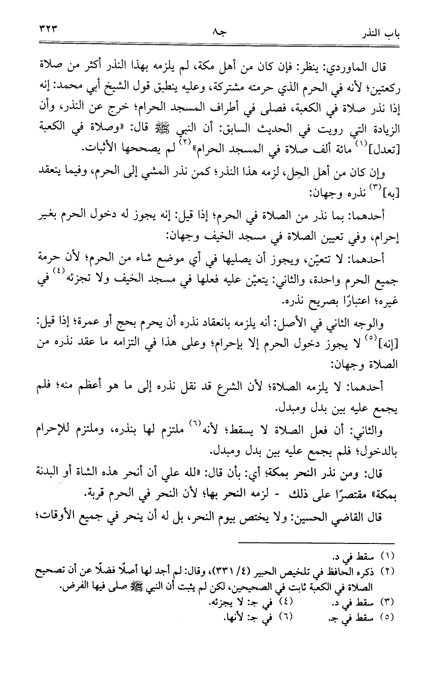 قال الماوردي: ينظر: فإن كان من أهل مكة، لم يلزمه بهذا النذر أكثر من صلاة ركعتين؛ لأنه في الحرم الذي حرمته مشتركة، وعليه ينطبق قول الشيخ أبي محمد: إنه إذا نذر صلاة في الكعبة، فصلى في أطراف المسجد الحرام؛ خرج عن النذر، وأن الزيادة التي رويت في الحديث السابق: أن النبي - صلى الله عليه وسلم - قال: "وصلاة في الكعبة [تعدل] مائة ألف صلاة في المسجد الحرام" لم يصححها الأثبات.