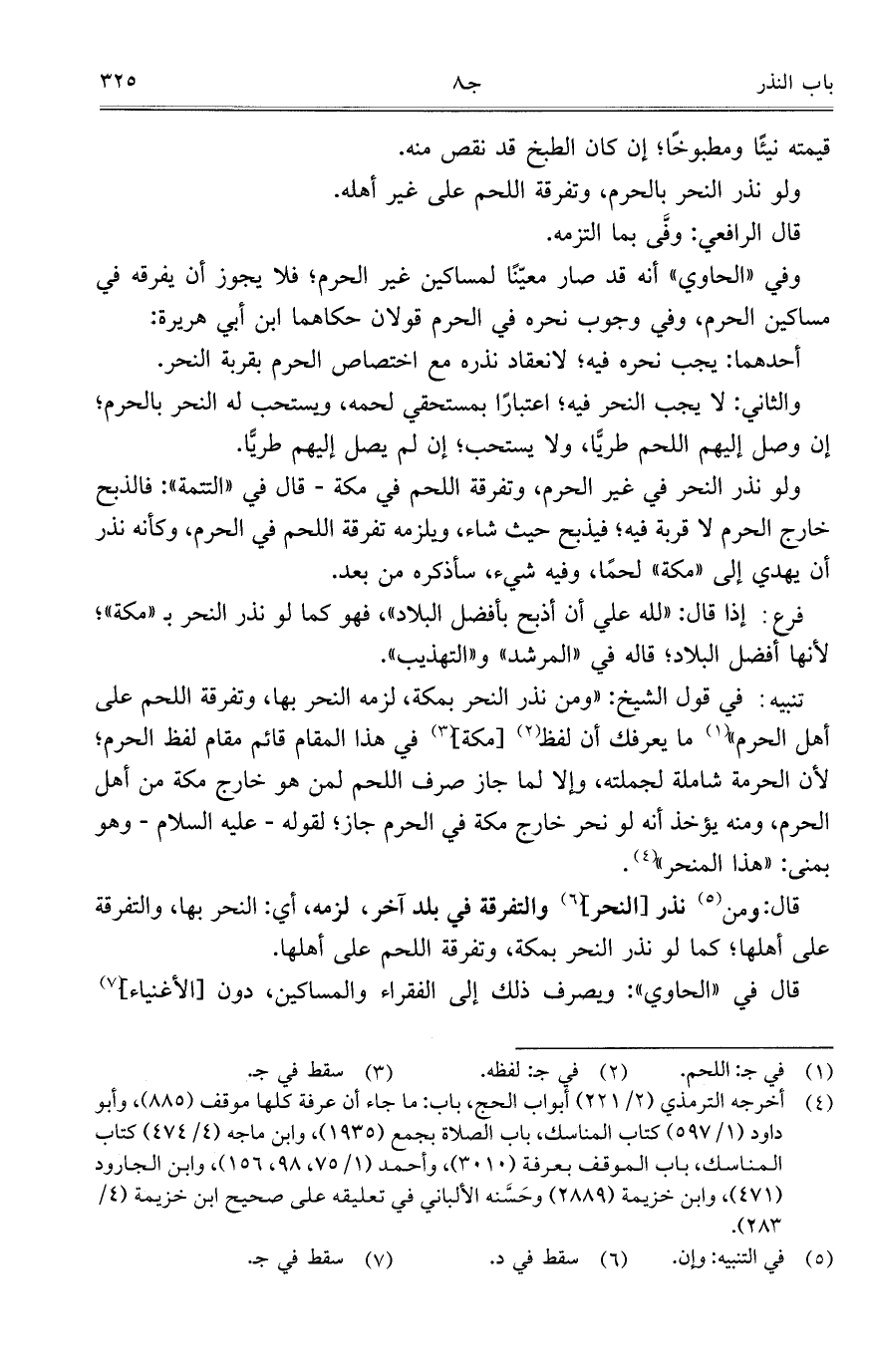 تنبيه: في قول الشيخ: "ومن نذر النحر بمكة، لزمه النحر بها، وتفرقة اللحم على أهل الحرم" ما يعرفك أن لفظ [مكة] في هذا المقام قائم مقام لفظ الحرم؛ لأن الحرمة شاملة لجملته، وإلا لما جاز صرف اللحم لمن هو خارج مكة من أهل الحرم، ومنه يؤخذ أنه لو نحر خارج مكة في الحرم جاز؛ لقوله- عليه السلام- وهو بمنى: "هذا المنحر".