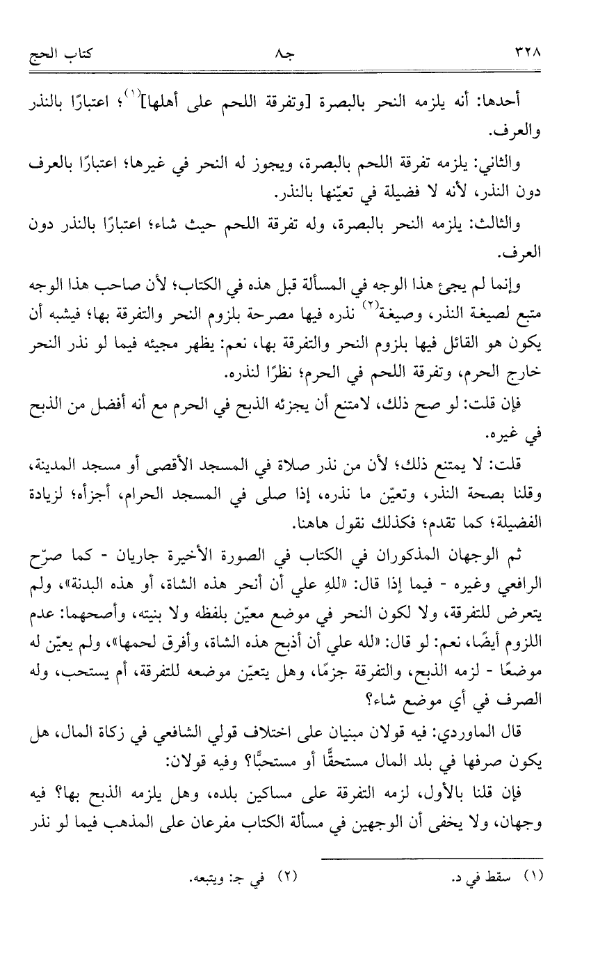 ثم الوجهان المذكوران في الكتاب في الصورة الأخيرة جاريان- كما صرح الرافعي وغيره- فيما إذا قال: "لله علي أن أنحر هذه الشاة، أو هذه البدنة"، ولم يتعرض للتفرقة، ولا لكون النحر في موضع معين بلفظه ولا بنيته، وأصحهما: عدم اللزوم أيضاً، نعم: لو قال: "لله علي أن أذبح هذه الشاة، وأفرق لحمها"، ولم يعين له موضعاً- لزمه الذبح، والتفرقة جزماً، وهل يتعين موضعه للتفرقة، أم يستحب، وله الصرف في أي موضع شاء؟