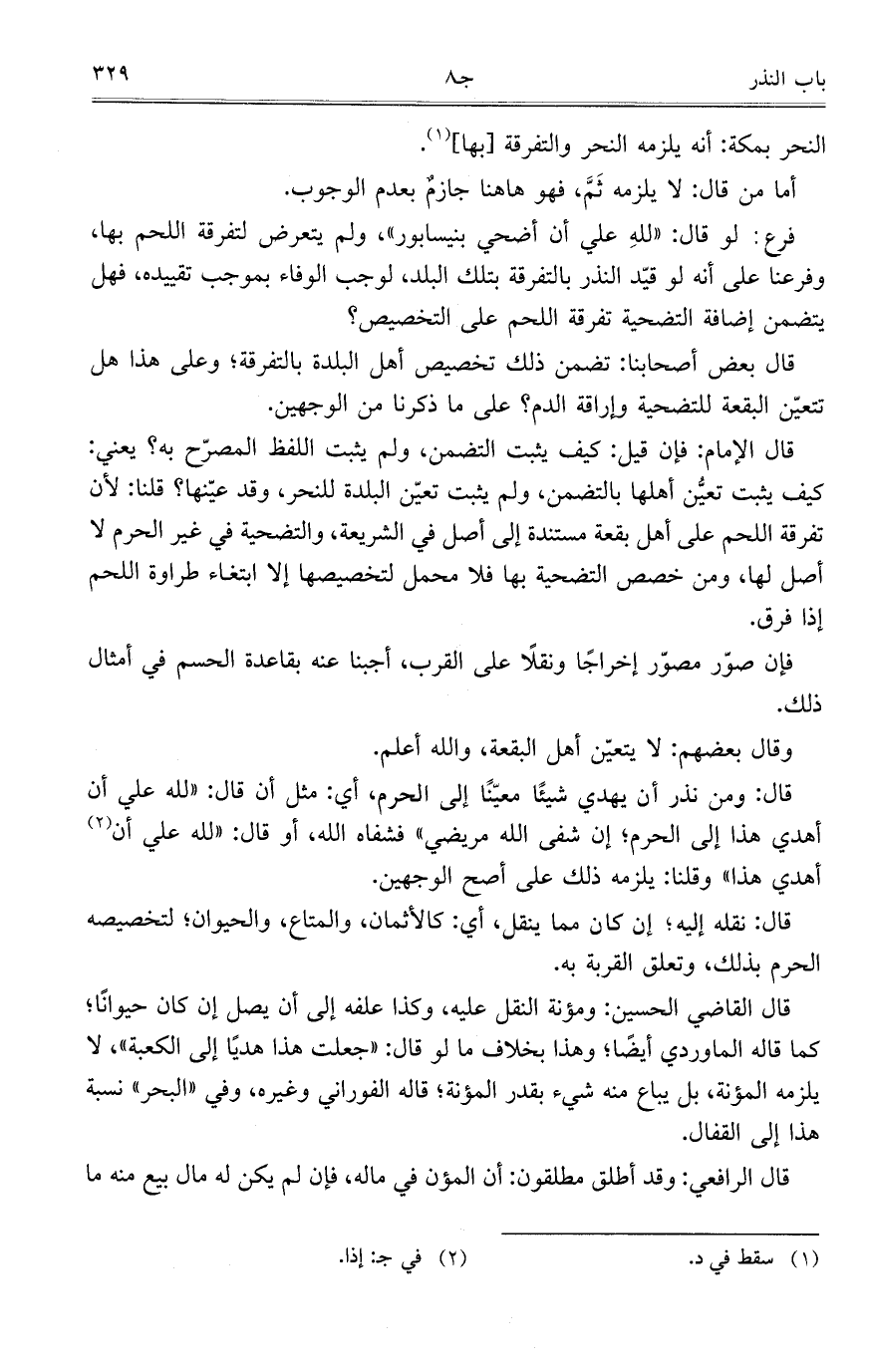 فرع: لو قال: "لله علي أن أضحي بنيسابور"، ولم يتعرض لتفرقة اللحم بها، وفرعنا على أنه لو قيد النذر بالتفرقة بتلك البلد، لوجب الوفاء بموجب تقييده، فهل يتضمن إضافة التضحية تفرقة اللحم على التخصيص؟