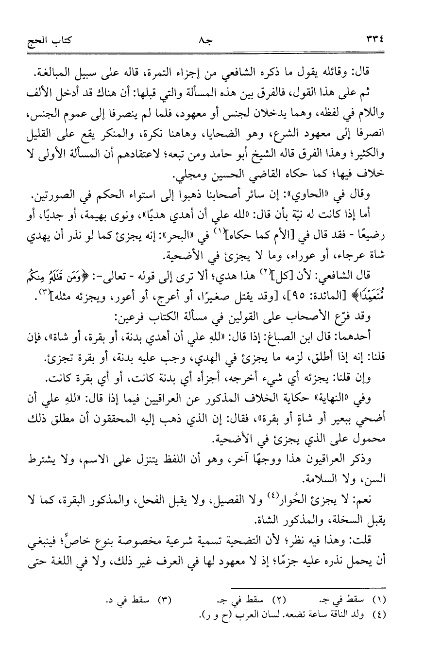 وفي "النهاية" حكاية الخلاف المذكور عن العراقيين فيما إذا قال: "لله علي أن أضحي ببعير أو شاة أو بقرة"، فقال: إن الذي ذهب إليه المحققون أن مطلق ذلك محمول على الذي يجزئ في الأضحية.