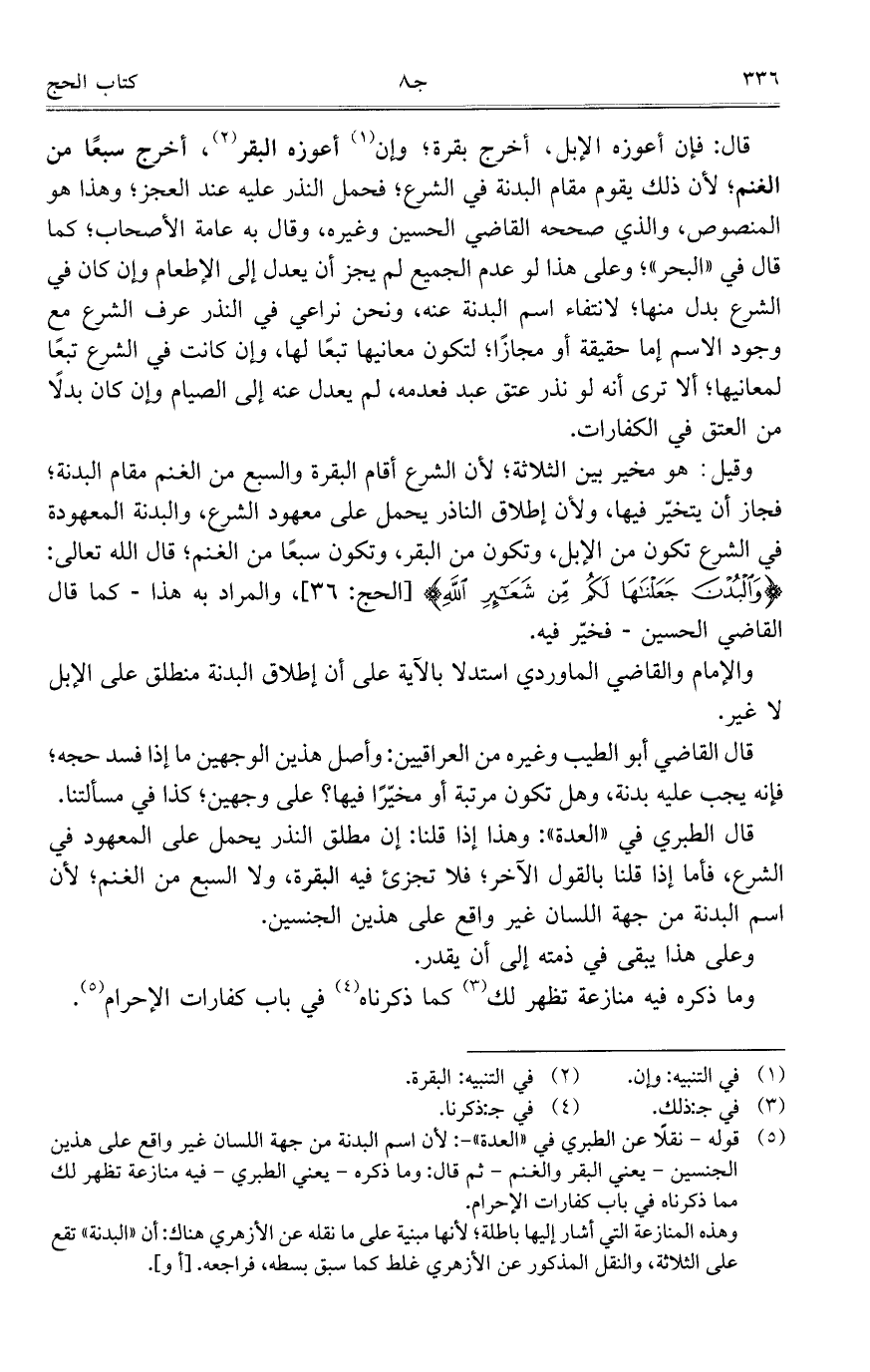 قال الطبري في "العدة": وهذا إذا قلنا: إن مطلق النذر يحمل على المعهود في الشرع، فأما إذا قلنا بالقول الآخر؛ فلا تجزئ فيه البقرة، ولا السبع من الغنم؛ لأن اسم البدنة من جهة اللسان غير واقع على هذين الجنسين.