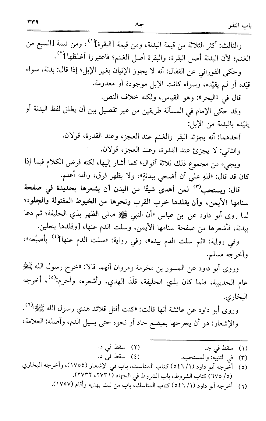 قال: ويستحب لمن أهدى شيئاً من البدن أن يشعرها بحديدة فيصفحة سنامها الأيمن، وأن يقلدها خرب القرب ونحوها من الخيوط المفتولة والجلود؛ لما روى أبو داود عن ابن عباس "أن النبي - صلى الله عليه وسلم - صلى الظهر بذي الحليفة؛ ثم دعا ببدنة، فأشعرها من صفحة سنامها الأيمن، وسلت الدم عنها، [وقلدها بنعلين.