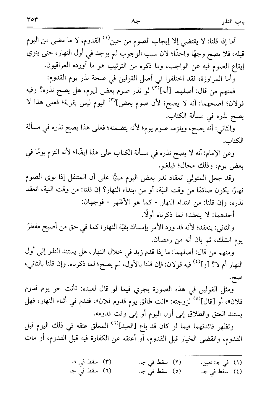 أما إذا قلنا: لا يقتضي إلا إيجاب الصوم من حين القدوم، لا ما مضى من اليوم قبله، فلا يصح وجهاً واحداً؛ لأن سبب الوجوب لم يوجد في أول النهار، حتى ينوي إيقاع الصةوم فيه عن الواجب، وما ذكره من الترتيب هو ما أورده العراقيون.