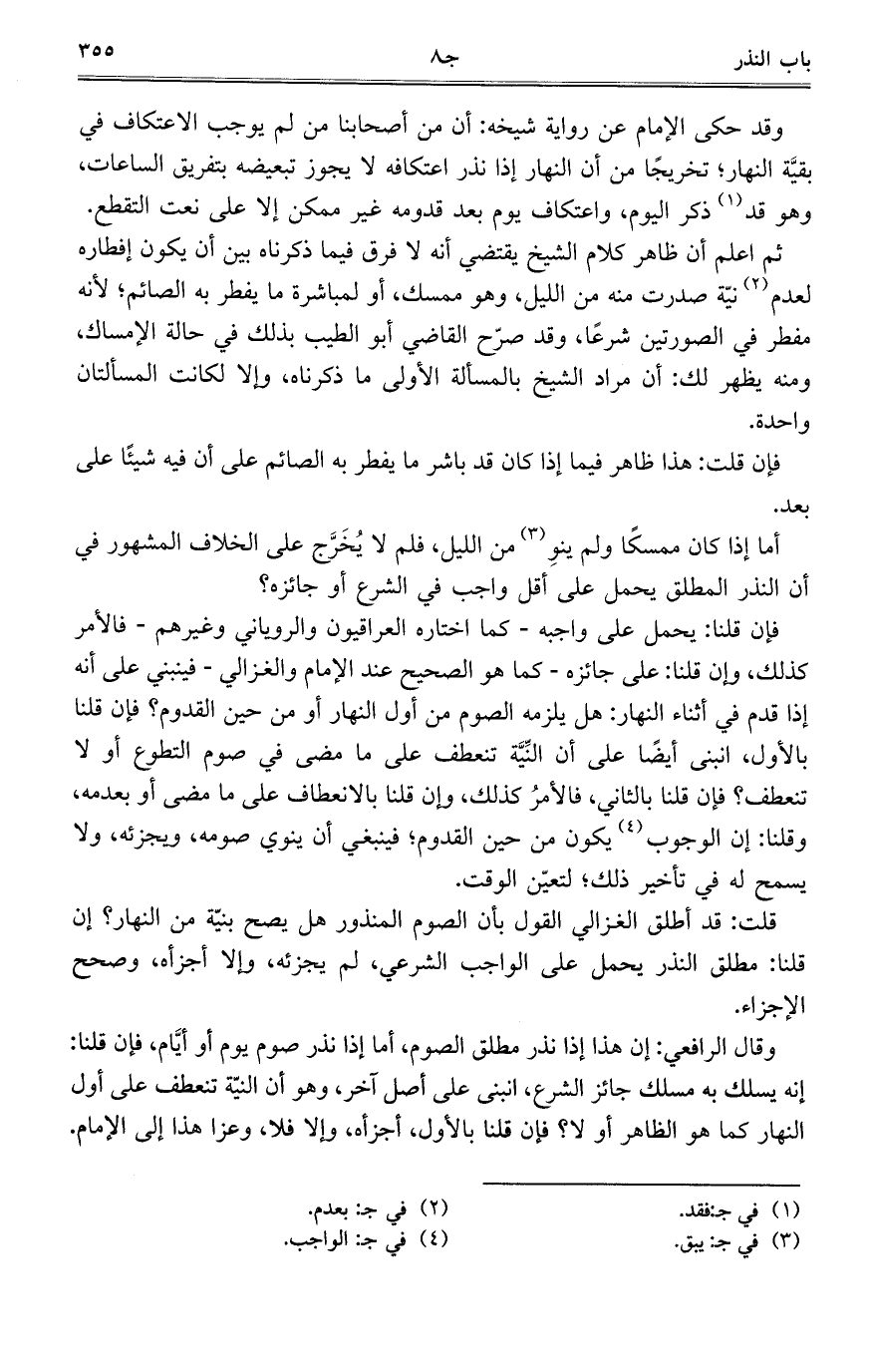 وقال الرافعي: إن هذا إذا نذر مطلق الصوم، أما إذا نذر صوم يوم أو أيام، فإن قلنا: إنه يسلك به مسلك جائز الشرع، انبنى على أصل آخر، وهو أن النية تنعطف على أول النهار كما هو الظاهر أو لا؟ فإن قلنا بالأول، أجزأه، وإلا فلا، وعزا هذا إلى الإمام.