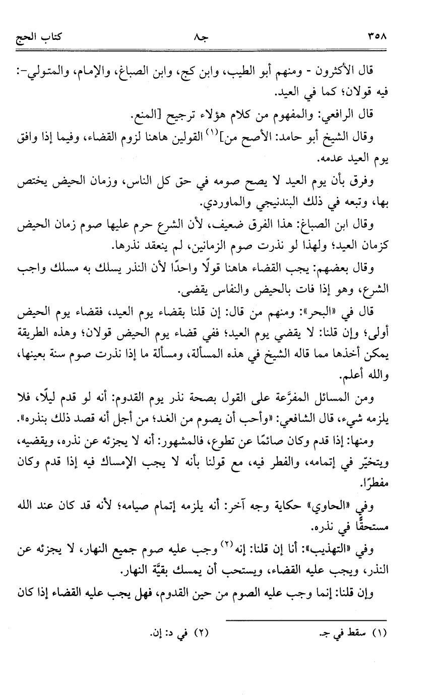 وفرق بأن يوم العيد لا يصح صومه في حق كل الناس، وزمان الحيض يختص بها، وتبعه في ذلك البندنيجي والماوردي.