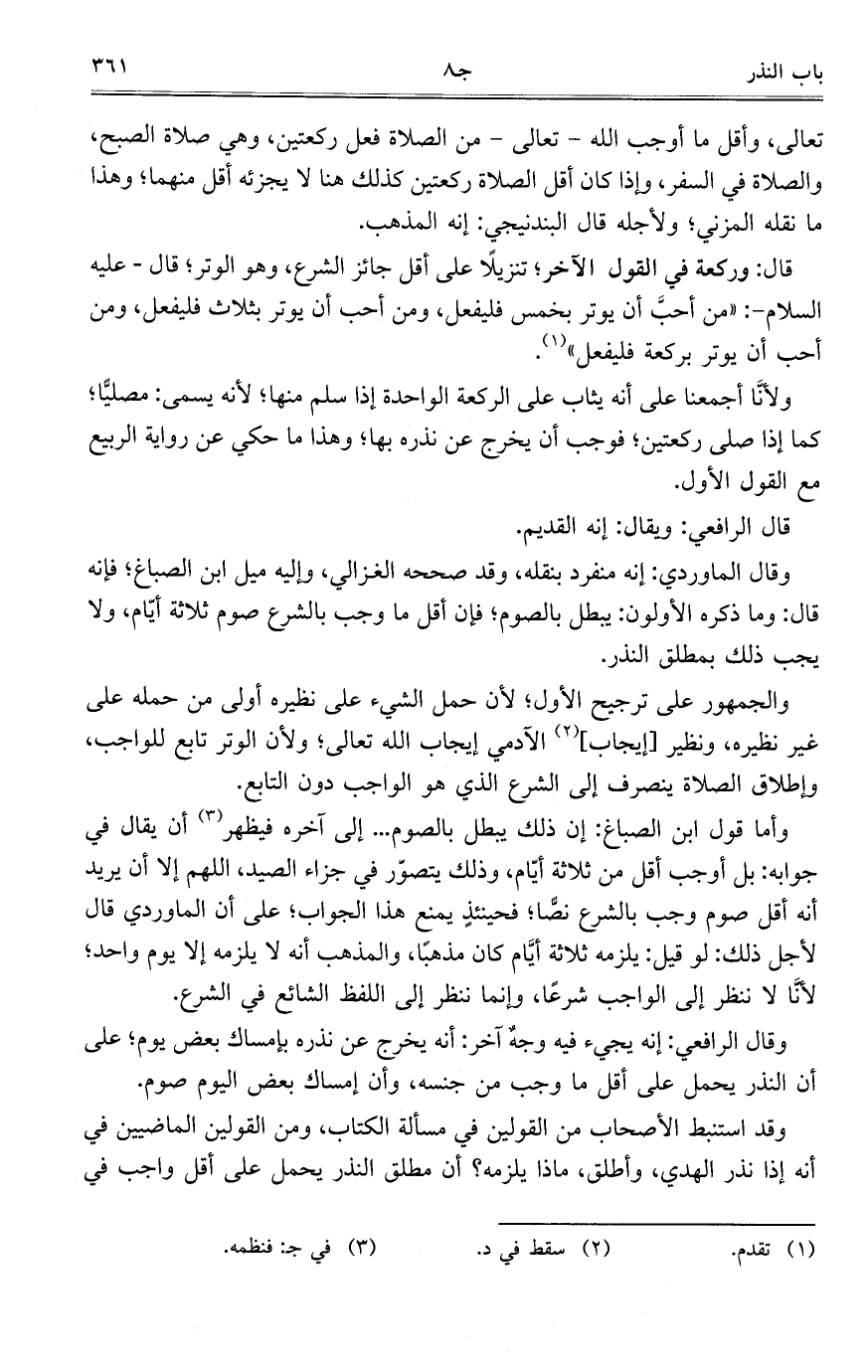 وقال الماوردي: إنه منفرد بنقله، وقد صححه الغزالي، وإليه ميل ابن الصباغ؛ فإنه قال: وما ذكره الأولون: يبطل بالصوم؛ فإن أقل ما وجب بالشرع صوم ثلاثة أيام، ولا يجب ذلك بمطلق النذر.