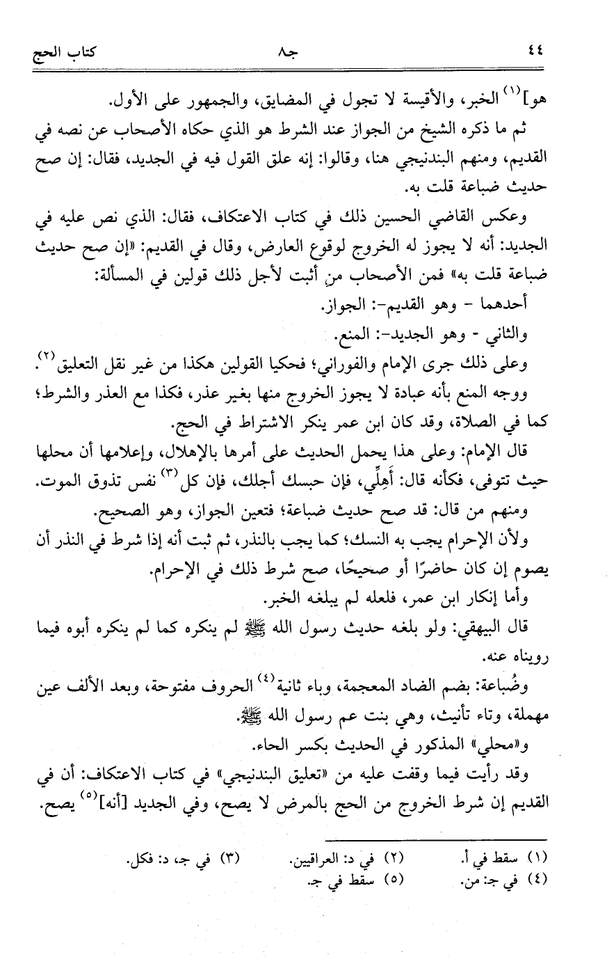 وعكس القاضي الحسين ذلك في كتاب الاعتكاف، فقال: الذي نص عليه في الجديد: أنه لا يجوز له الخروج لوقوع العارض، وقال في القديم: "إن صح حديث ضباعة قلت به" فمن الأصحاب من أثبت لأجل ذلك قولين في المسألة: