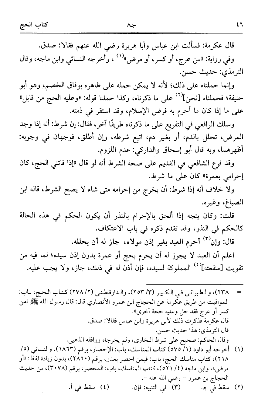قلت: وكان يتجه إذا ألحق بالإحرام بالنذر أن يكون الحكم في هذه الحالة كالحكم في النذر، وقد تقدم ذكره في باب الاعتكاف.