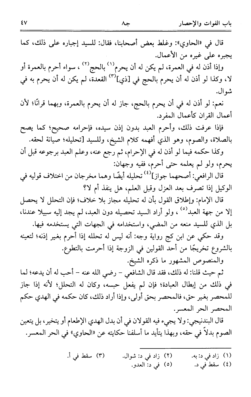 قال الإمام: وإطلاق القول بأن له تحليله مجاز بلا خلاف؛ فإن التحلل لا يحصل إلا من جهة العبد، ولو أراد السيد تحصيله دون العبد، لم يجد إليه سبيلاً عندنا، بل الذي للسيد منعه من المضي، واستخدامه في الجهات التي يستخدمه فيها.