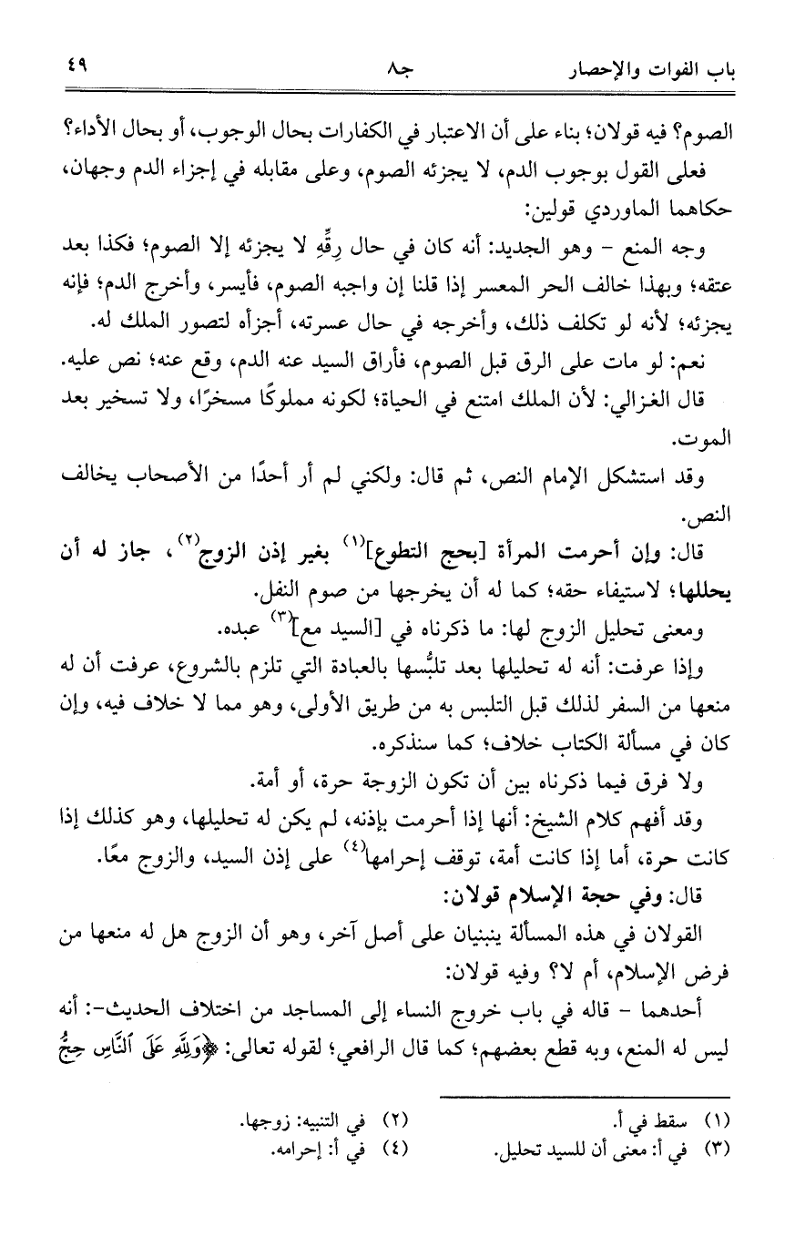 وقد أفهم كلام الشيخ: أنها إذا أحرمت بإذنه، لم يكن له تحليلها، وهو كذلك إذا كانت حرة، أما إذا كانت أمة، توقف إحرامها على إذن السيد، والزوج معاً.