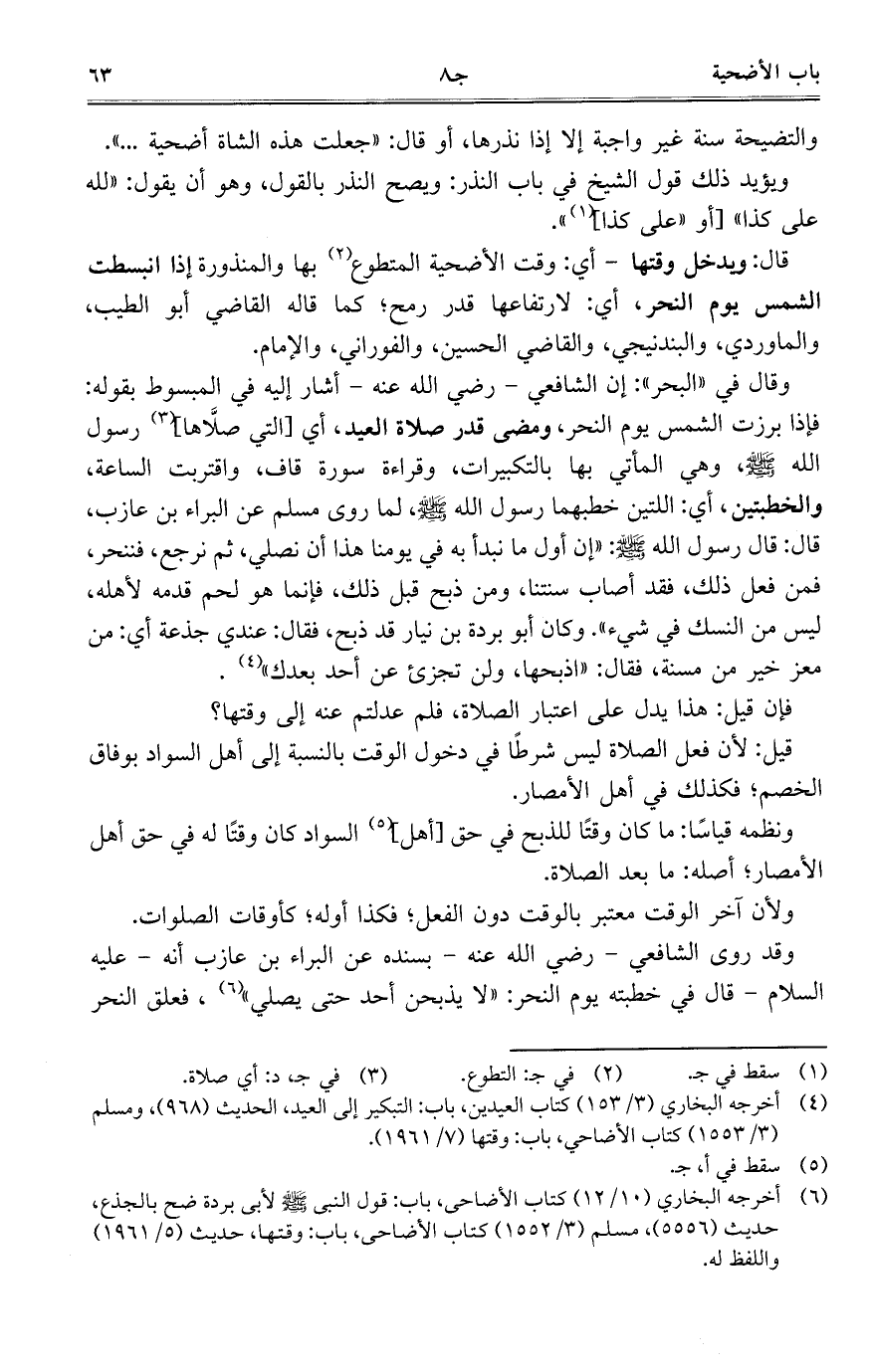 وقد روى الشافعي- رضي الله عنه- بسنده عن البراء بن عازب أنه- عليه السلام- قال في خطبته يوم النحر: "لا يذبحن أحد حتى يصلي"، فعلق النحر