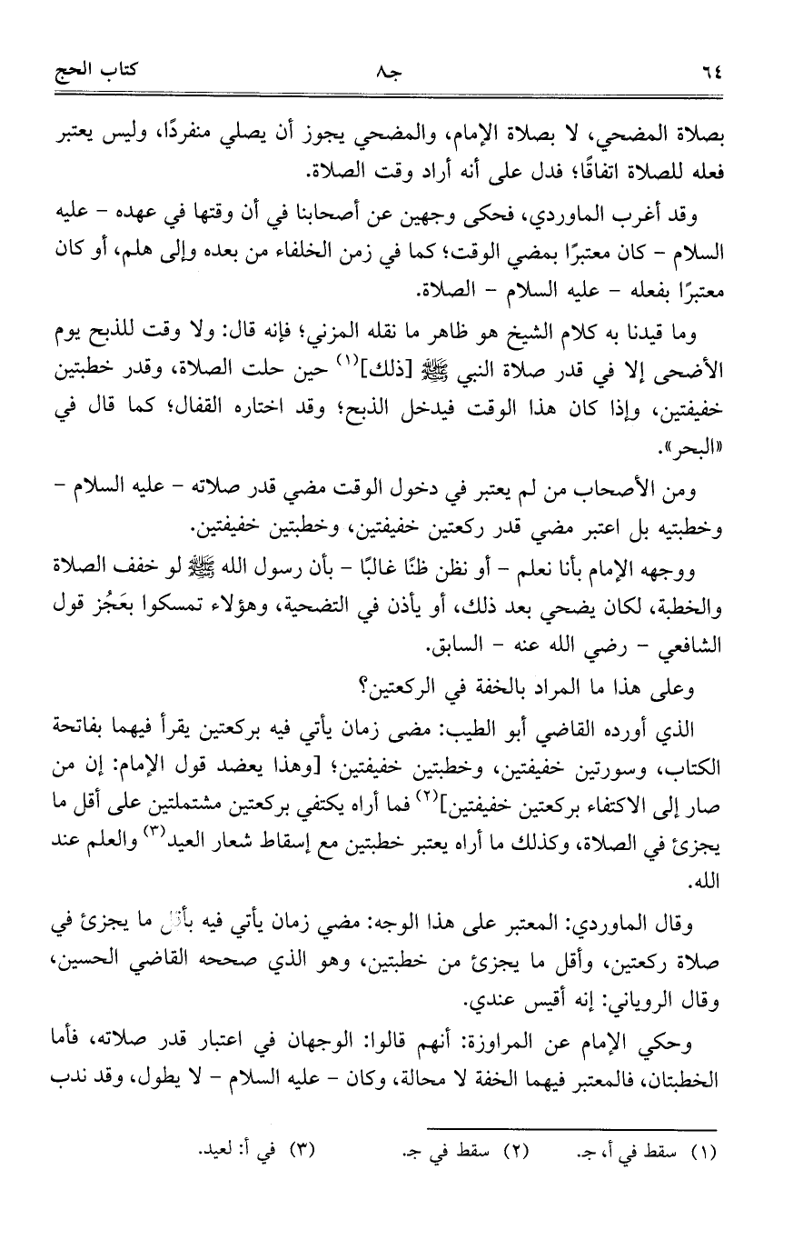 ووجهه الإمام بأنا نعلم- أو نظن ظناً غالباً- بأن رسول الله - صلى الله عليه وسلم - لو خفف الصلاة والخطبة، لكان يضحي بعد ذلك، أو يأذن في التضحية، وهؤلاء تمسكوا بعَجُز قول الشافعي- رضي الله عنه- السابق.