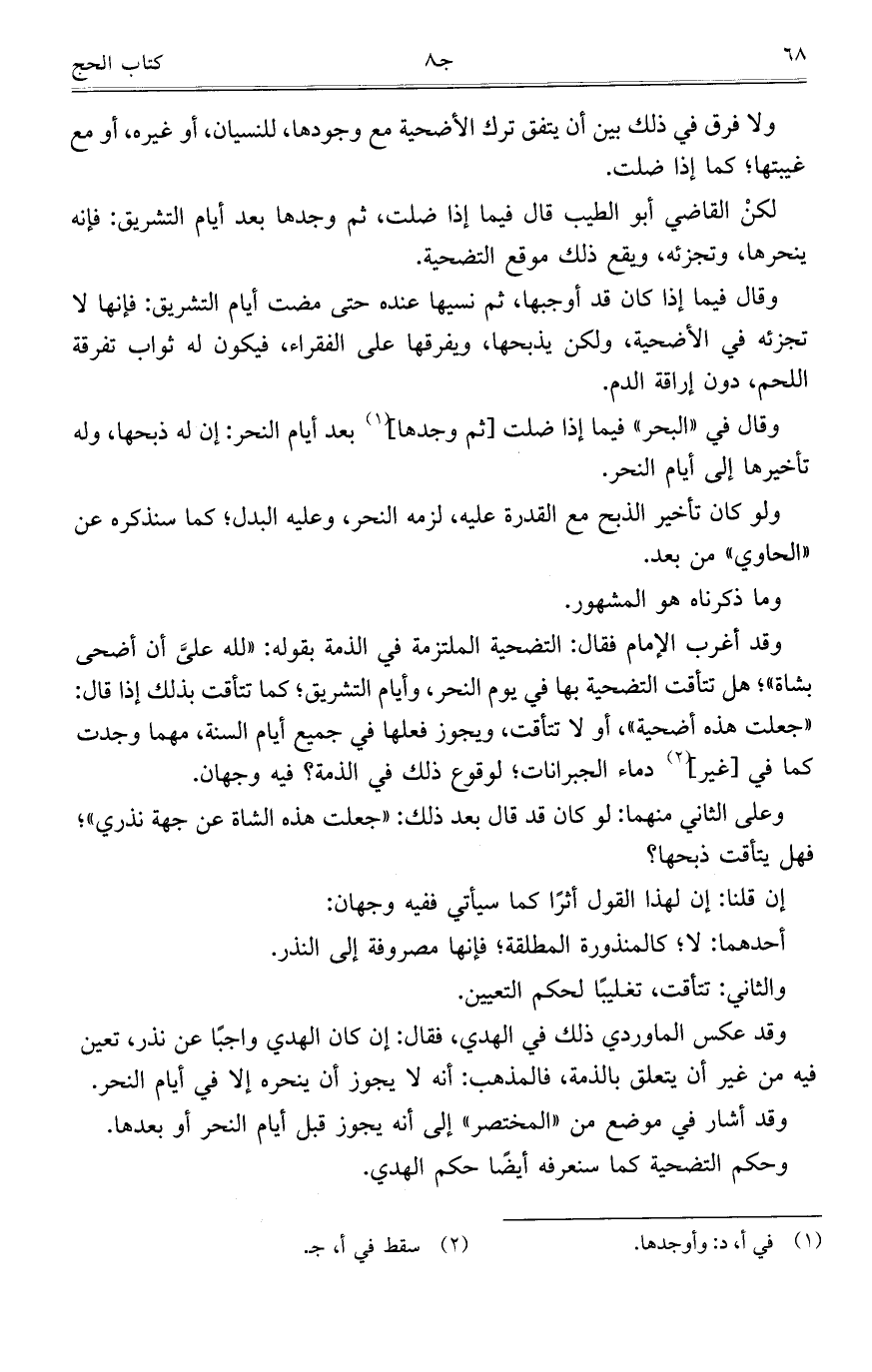 وقد أغرب الإمام فقال: التضحية الملتزمة في الذمة بقوله: "لله عليَّ أن أضحى بشاة"؛ هل تتأقت التضحية بها في يوم النحر، وأيام التشريق؛ كما تتأقت بذلك إذا قال: "جعلت هذه أضحية"، أو لا تتأقت، ويجوز فعلها في جميع أيام السنة، مهما وجدت كما في [غير] دماء الجبرانات؛ لوقوع ذلك في الذمة؟ فيه وجهان.