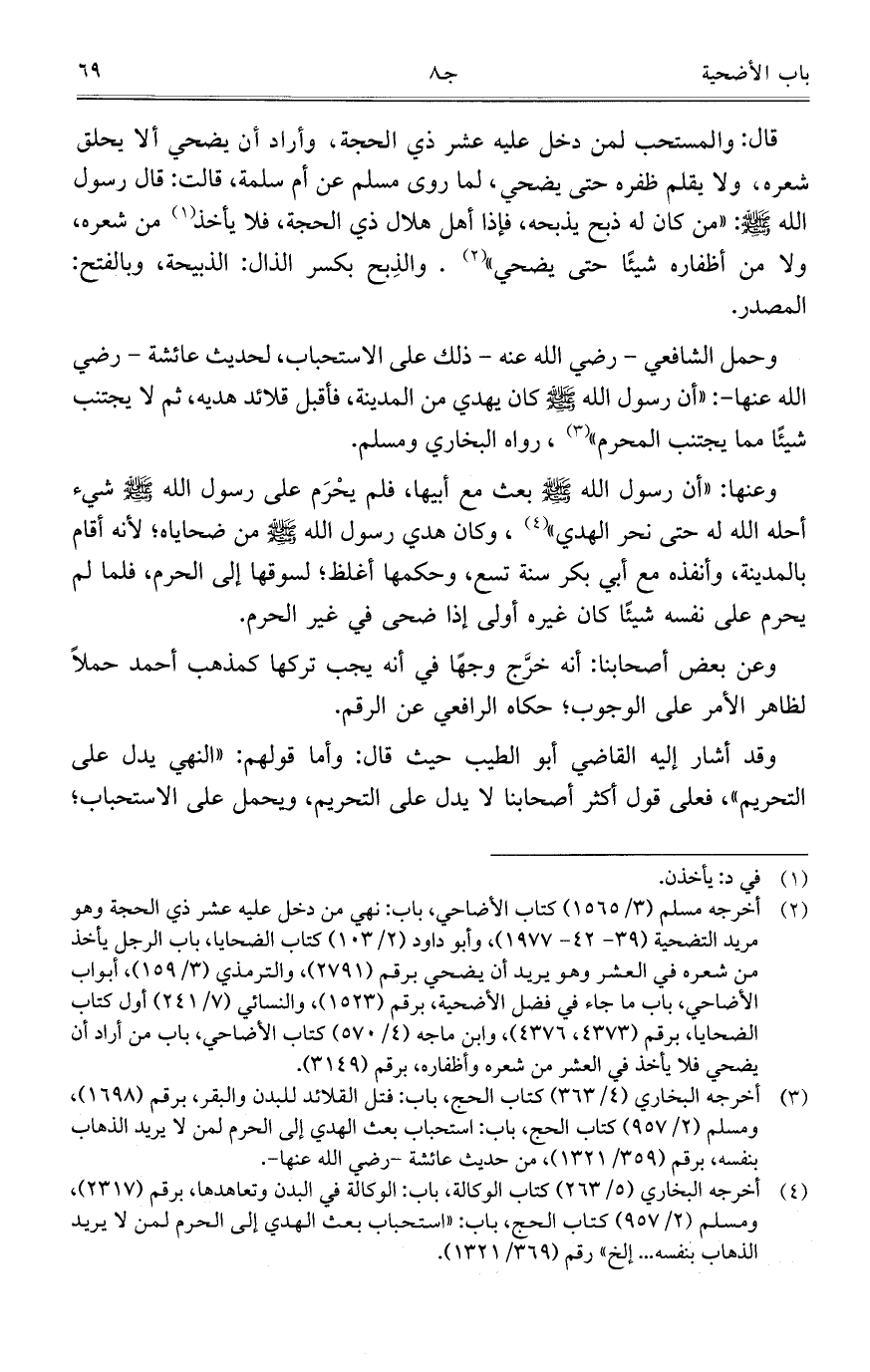 قال: والمستحب لمن دخل عليه عشر ذي الحجة، وأراد أن يضحي ألا يحلق شعره، ولا يقلم ظفره حتى يضحي، لما روى مسلم عن أم سلمة، قالت: قال رسول الله - صلى الله عليه وسلم -: "من كان له ذبح يذبحه؛ فإذا أهل هلال ذي الحجة، فلا يأخذ من شعره، ولا من أظفاره شيئاً من حتى يضحي". والذبح بكسر الذال: الذبيحة، وبالفتح: المصدر.