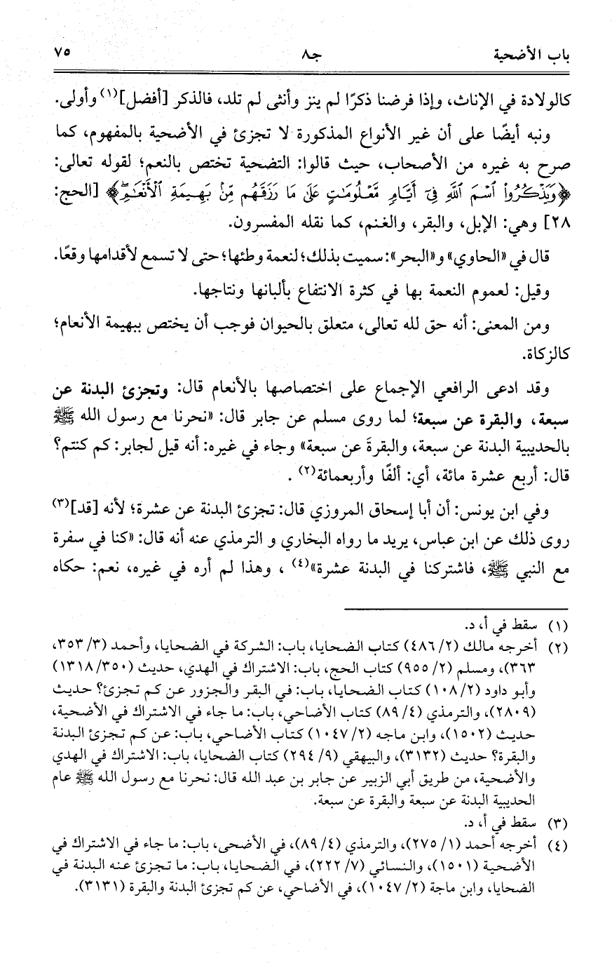 وقد ادعى الرافعي الإجماع على اختصاصها بالأنعام قال: وتجزئ البدنة عن سبعة، والبقرة عن سبعة؛ لما روى مسلم عن جابر قال: "نحرنا مع رسول الله - صلى الله عليه وسلم - بالحديبية البدنة عن سبعة، والبقرةَ عن سبعة" وجاء في غيره: أنه قيل لجابر: كم كنتم؟ قال: أربع عشرة مائة، أي: ألفاً وأربعمائة.