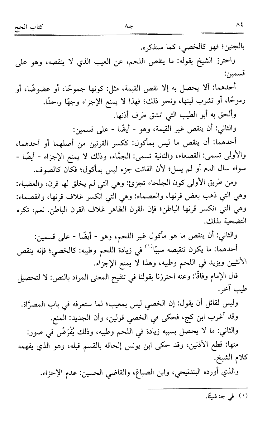 واحترز الشيخ بقوله: ما ينقص اللحم، عن العيب الذي لا ينقصه، وهو على قسمين: