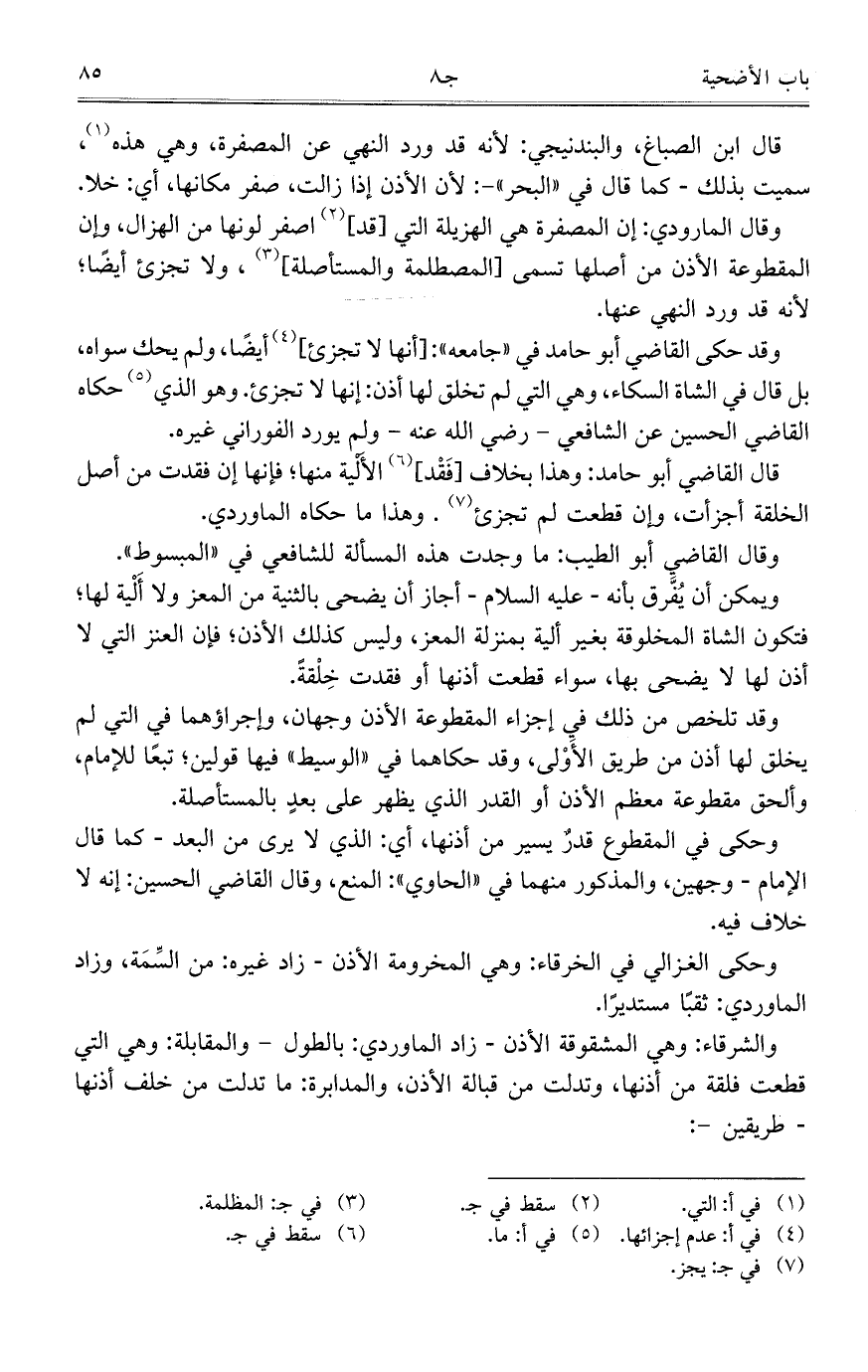 وقال الماوردي: إن المصفرة هي الهزيلة التي [قد] اصفر لونها من الهزال، وإن المقطوعة الأذن من أصلها تسمى [المصطلمة والمستأصلة]، ولا تجزئ أيضاً؛ لأنه قد ورد النهي عنها.