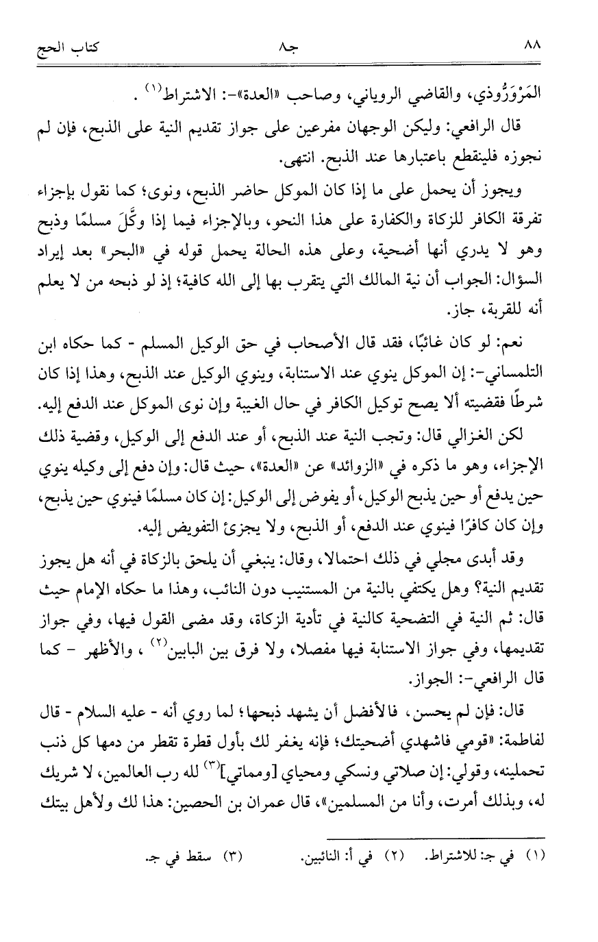 وقد أبدى مجلي في ذلك احتمالاً، وقال: ينبغي أن يلحق بالزكاة في أنه هل يجوز تقديم النية؟ وهل يكتفي بالنية من المستنيب دون النائب، وهذا ما حكاه الإمام حيث قال: ثم النية في التضحية كالنية في تأدية الزكاة، وقد مضى القول فيها، وفي جواز تقديمها، وفي جواز الاستنابة فيها مفصلاً، ولا فرق بين البابين، والأظهر- كما قال الرافعي-: الجواز.